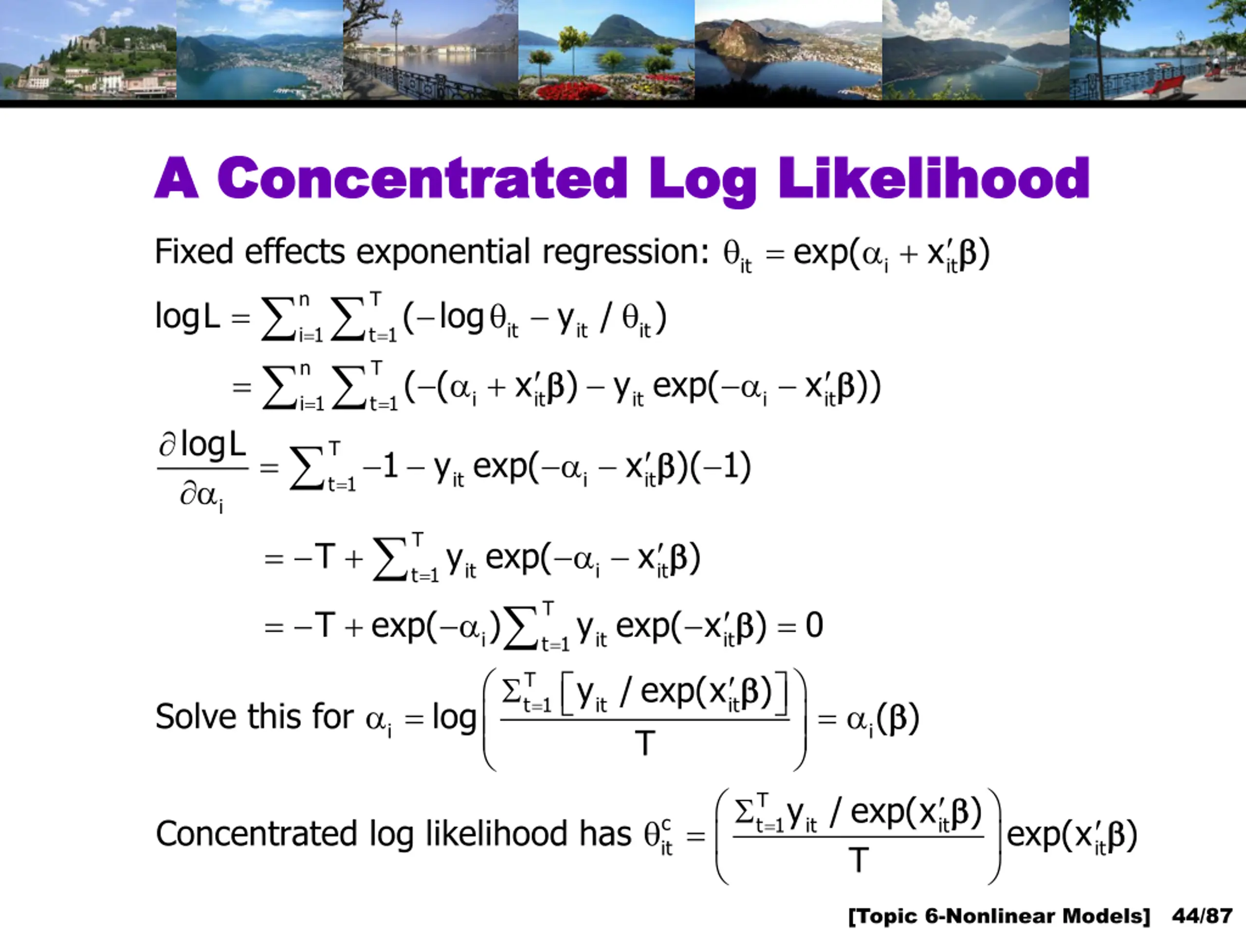A Concentrated Log Likelihood A Concentrated Log Likelihood Fixed effects exponential regression: it = it + i exp( x ) n T = it logL ( log y / ) it it = i 1 n = t 1 T it it = + ( ( x ) y exp( x )) i it i = i 1 = t 1 logL T it = 1 y exp( x )( 1) it i = t 1 i exp( T i = + t T y exp( x ) it i = t 1 T it = + = T ) y exp( x ) 0 i it = t 1 it T t 1 y / exp(x T ) = it = i = ( ) Solve this for log i it T t 1 y / exp(x T ) it c = it Concentrated log likelihood has exp(x ) = it [Topic 6-Nonlinear Models] 44/87