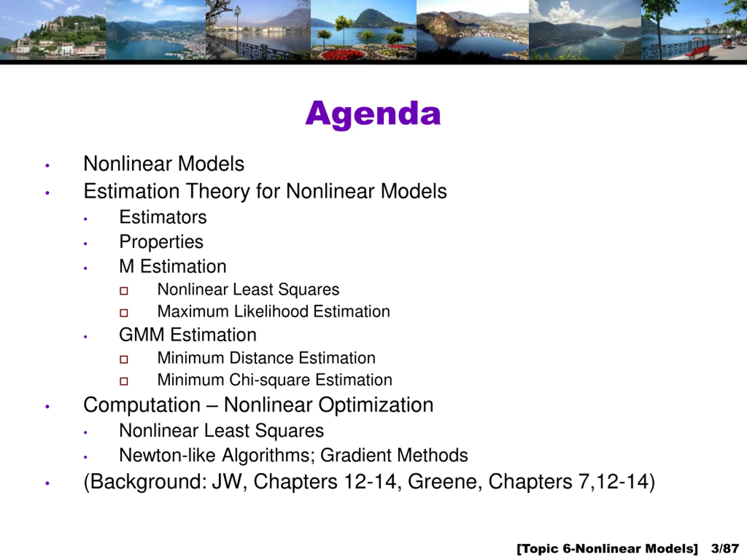Agenda Nonlinear Models Estimation Theory for Nonlinear Models Estimators Properties M Estimation Nonlinear Least Squares Maximum Likelihood Estimation GMM Estimation Minimum Distance Estimation Minimum Chi-square Estimation Computation Nonlinear Optimization Nonlinear Least Squares Newton-like Algorithms; Gradient Methods (Background: JW, Chapters 12-14, Greene, Chapters 7,12-14) [Topic 6-Nonlinear Models] 3/87