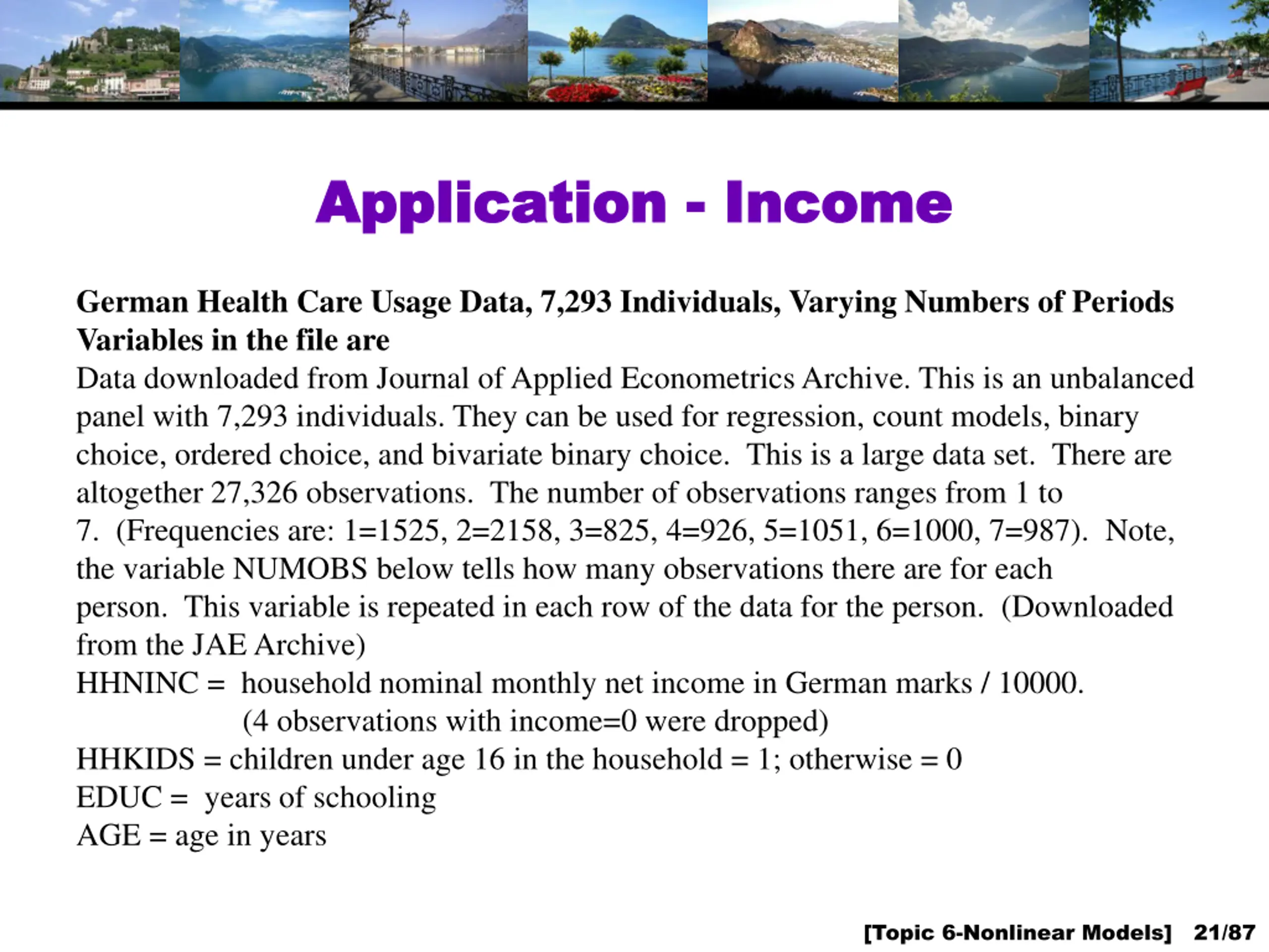 Application Application - - Income Income German Health Care Usage Data, 7,293 Individuals, Varying Numbers of Periods Variables in the file are Data downloaded from Journal of Applied Econometrics Archive. This is an unbalanced panel with 7,293 individuals. They can be used for regression, count models, binary choice, ordered choice, and bivariate binary choice. This is a large data set. There are altogether 27,326 observations. The number of observations ranges from 1 to 7. (Frequencies are: 1=1525, 2=2158, 3=825, 4=926, 5=1051, 6=1000, 7=987). Note, the variable NUMOBS below tells how many observations there are for each person. This variable is repeated in each row of the data for the person. (Downloaded from the JAE Archive) HHNINC = household nominal monthly net income in German marks / 10000. (4 observations with income=0 were dropped) HHKIDS = children under age 16 in the household = 1; otherwise = 0 EDUC = years of schooling AGE = age in years [Topic 6-Nonlinear Models] 21/87