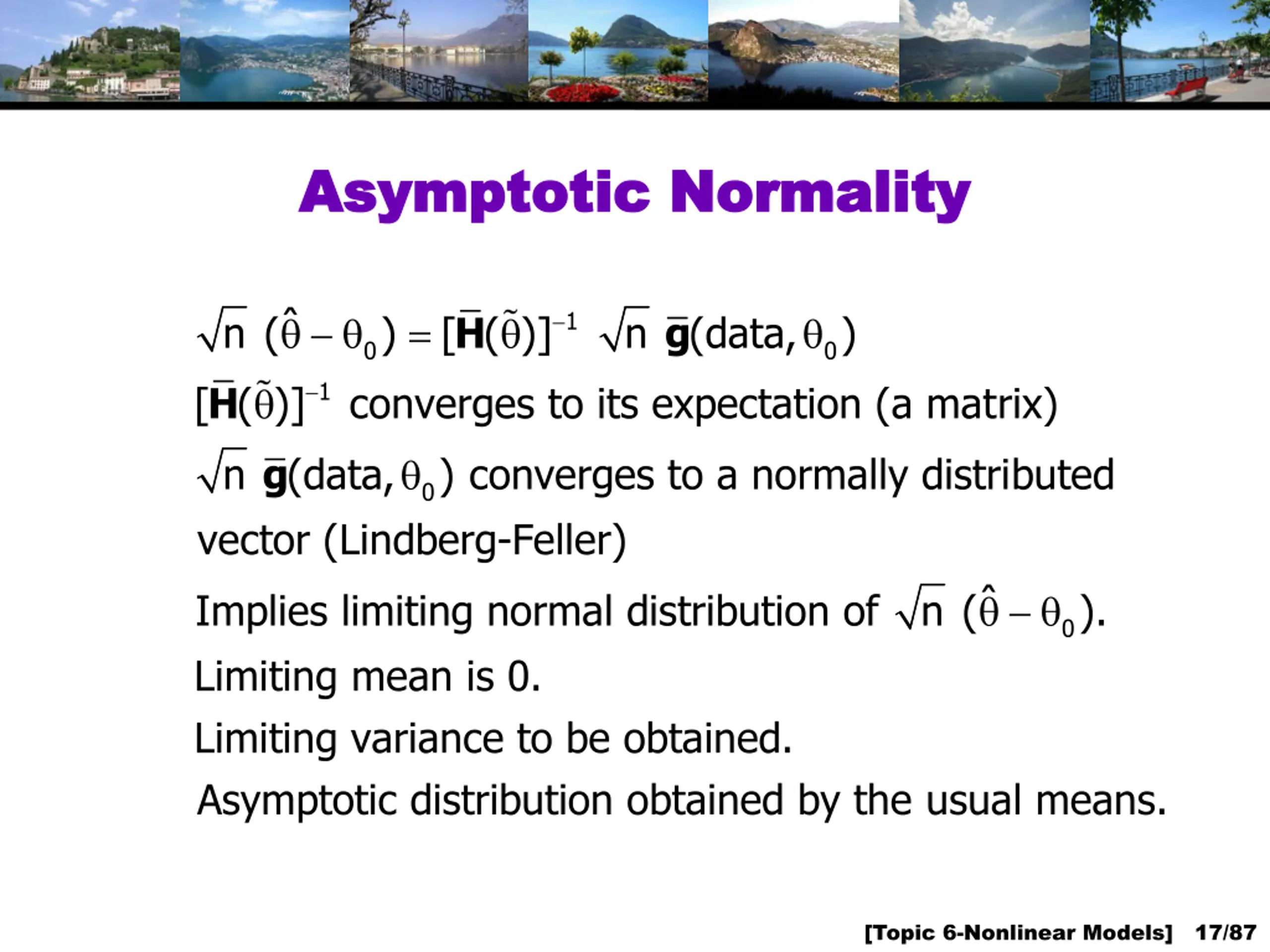 Asymptotic Normality Asymptotic Normality 1 = [ ( )] n (data, H n ( H ) g ) 0 0 1 [ ( )] converges to its expectation (a matrix) g n (data, vector (Lindberg-Feller) ) converges to a normally distributed 0 Implies limiting normal distribution of n ( Limiting mean is 0. Limiting variance to be obtained. Asymptotic distribution obtained by the usual means. 0). [Topic 6-Nonlinear Models] 17/87