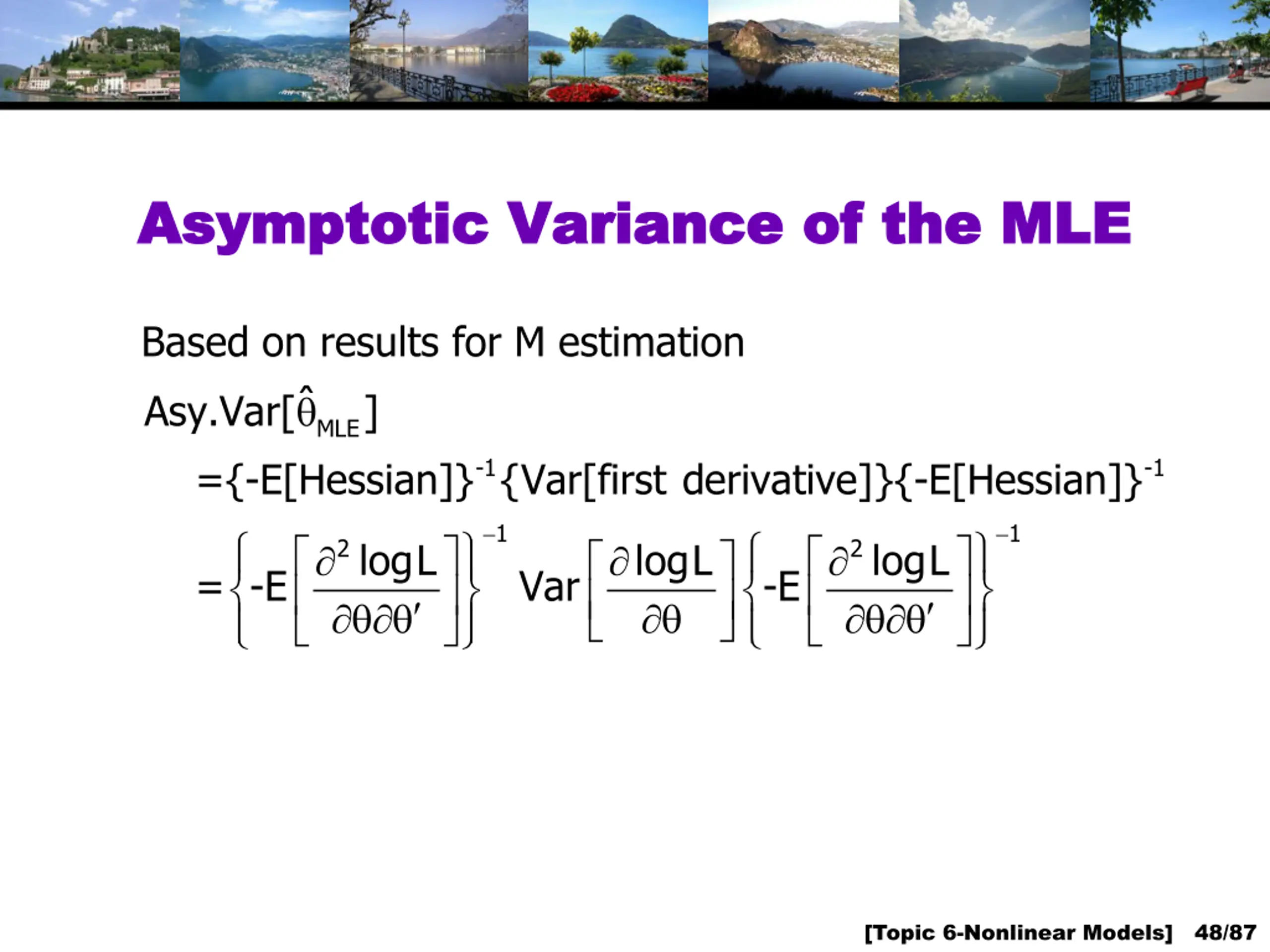 Asymptotic Variance of the MLE Asymptotic Variance of the MLE Based on results for M estimation Asy.Var[ ] ={-E[Hessian]} {Var[first derivative]}{-E[Hessian]} MLE -1 -1 1 1 2 2 logL logL logL = -E Var -E [Topic 6-Nonlinear Models] 48/87