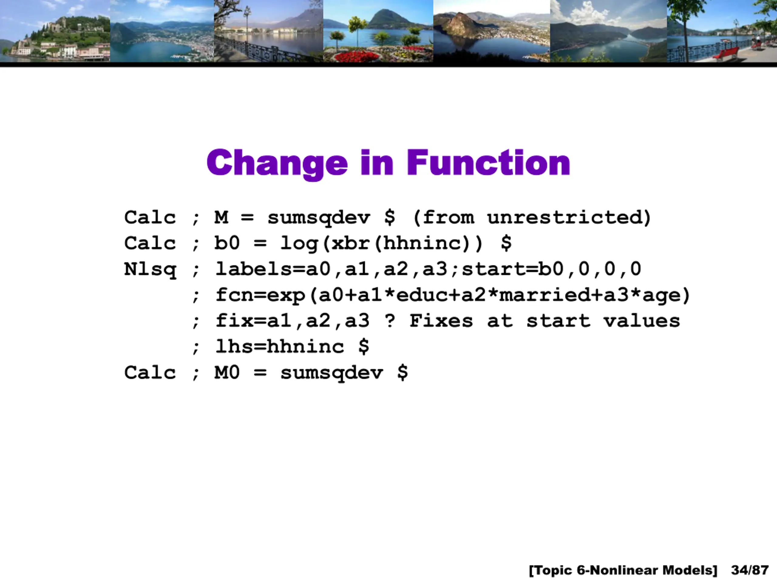 Change in Function Change in Function Calc ; M = sumsqdev $ (from unrestricted) Calc ; b0 = log(xbr(hhninc)) $ Nlsq ; labels=a0,a1,a2,a3;start=b0,0,0,0 ; fcn=exp(a0+a1*educ+a2*married+a3*age) ; fix=a1,a2,a3 ? Fixes at start values ; lhs=hhninc $ Calc ; M0 = sumsqdev $ [Topic 6-Nonlinear Models] 34/87