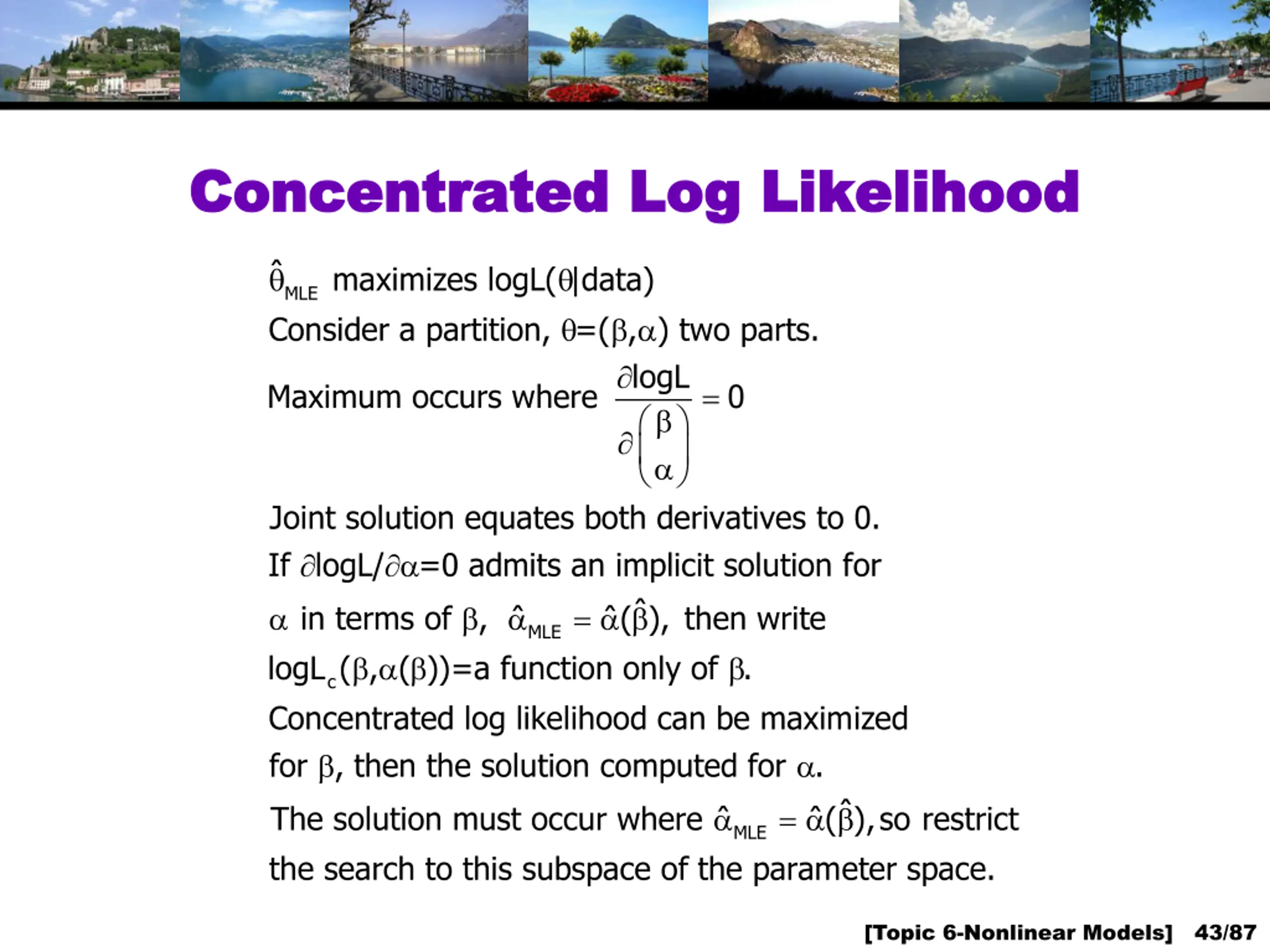 Concentrated Log Likelihood Concentrated Log Likelihood Consider a partition, =( , ) two parts. maximizes logL( |data) MLE logL = Maximum occurs where 0 Joint solution equates both derivatives to 0. If logL/ =0 admits an implicit solution for in = c logL ( , ( ))=a function only of . Concentrated log likelihood can be maximized for , then the solution computed for . The solution must occur where the search to this subspace of the parameter space. terms of , ( ), then write MLE = ( ) ,so restrict MLE [Topic 6-Nonlinear Models] 43/87