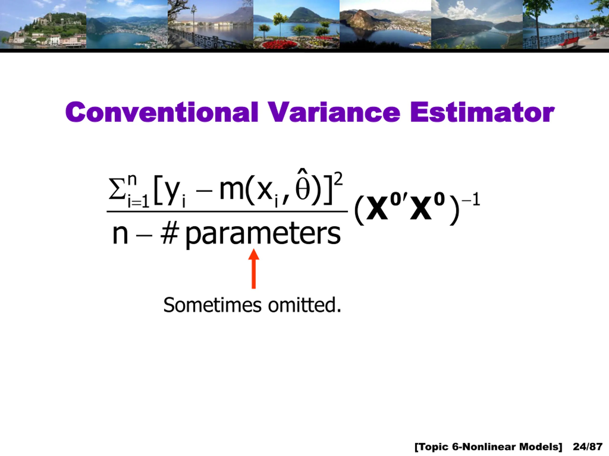 Conventional Variance Estimator Conventional Variance Estimator i n i 1 = 2 [y #parameters m(x , )]( 0 0 1 X X ) i n Sometimes omitted. [Topic 6-Nonlinear Models] 24/87