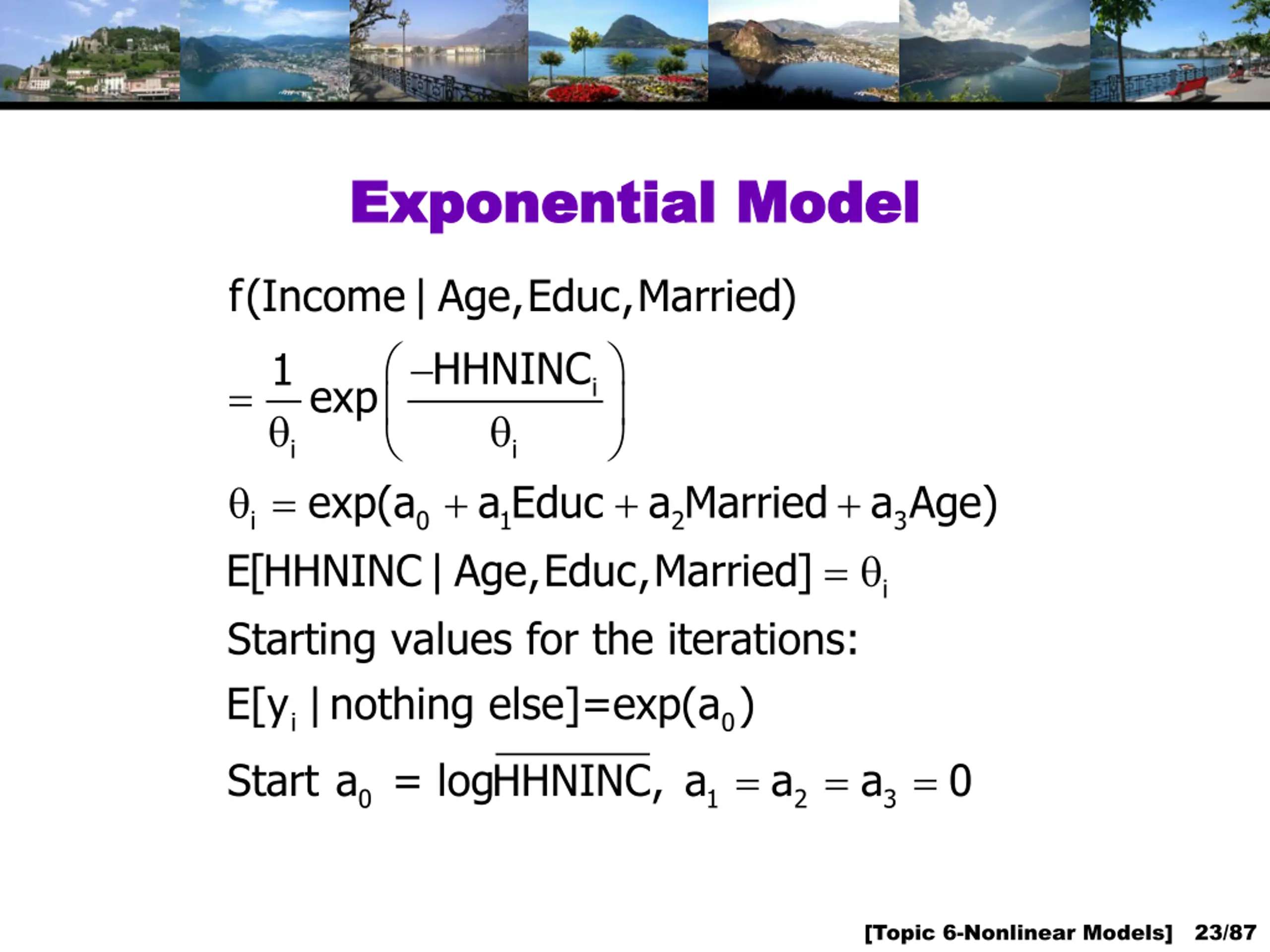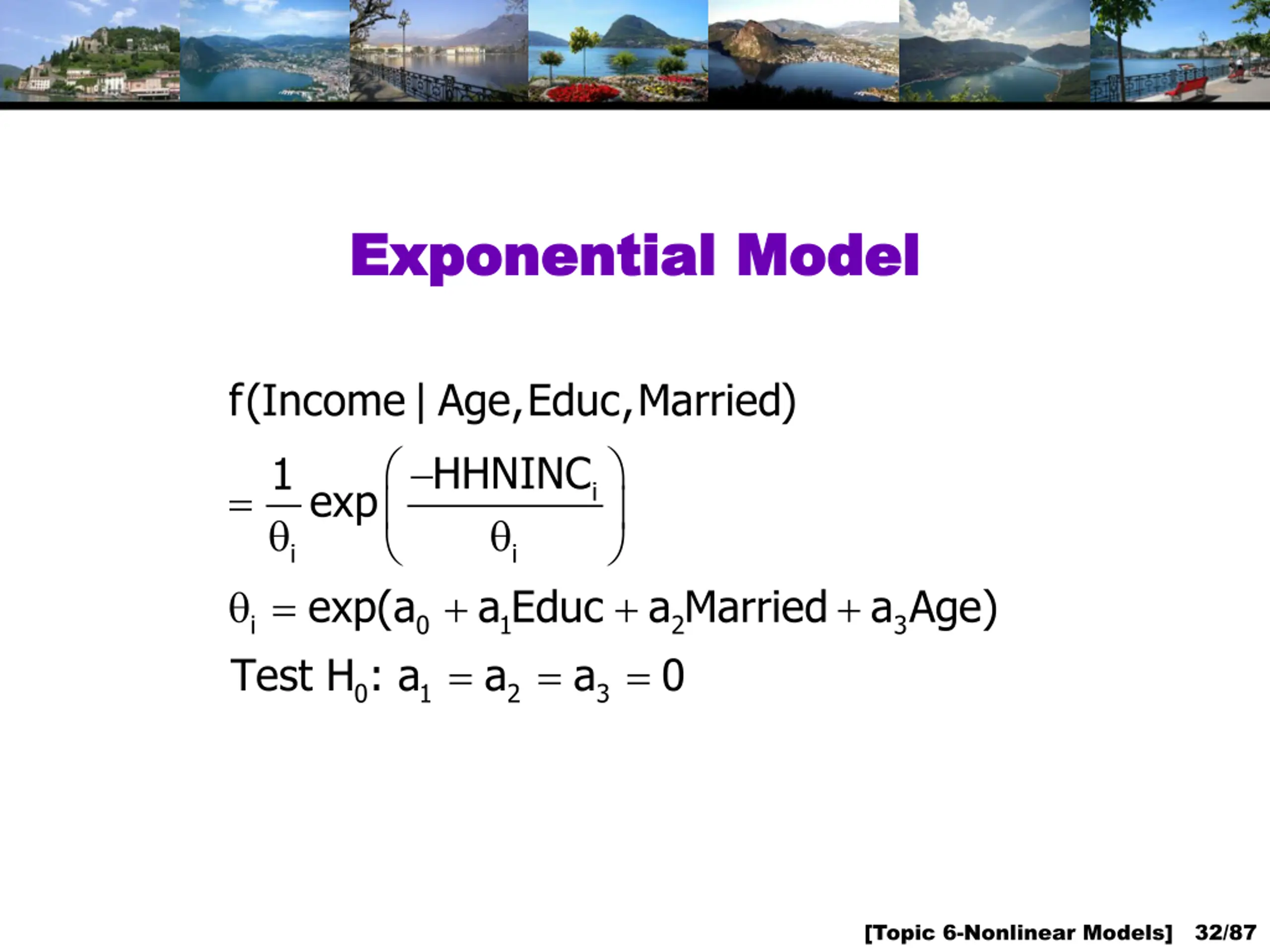 Exponential Model Exponential Model f(Income| Age,Educ,Married) HHNINC 1exp = = + = + i i i + exp(a a Educ a = a Married 0 = a Age) i 0 1 2 3 Test H : a a 0 1 2 3 [Topic 6-Nonlinear Models] 32/87
