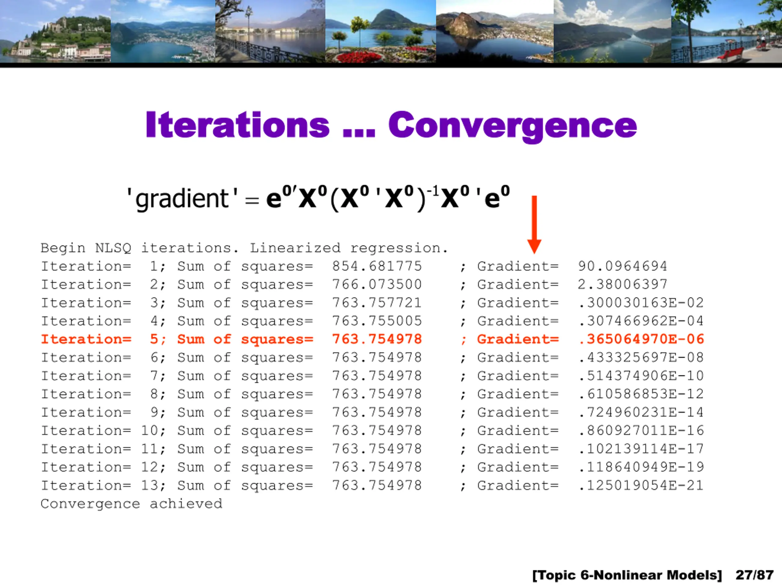 Iterations Convergence Iterations Convergence 0 0 0 0 -1 0 0 = 'gradient' e X ( X ' X ) X ' e Begin NLSQ iterations. Linearized regression. Iteration= 1; Sum of squares= 854.681775 ; Gradient= 90.0964694 Iteration= 2; Sum of squares= 766.073500 ; Gradient= 2.38006397 Iteration= 3; Sum of squares= 763.757721 ; Gradient= .300030163E-02 Iteration= 4; Sum of squares= 763.755005 ; Gradient= .307466962E-04 Iteration= 5; Sum of squares= 763.754978 ; Gradient= .365064970E-06 Iteration= 6; Sum of squares= 763.754978 ; Gradient= .433325697E-08 Iteration= 7; Sum of squares= 763.754978 ; Gradient= .514374906E-10 Iteration= 8; Sum of squares= 763.754978 ; Gradient= .610586853E-12 Iteration= 9; Sum of squares= 763.754978 ; Gradient= .724960231E-14 Iteration= 10; Sum of squares= 763.754978 ; Gradient= .860927011E-16 Iteration= 11; Sum of squares= 763.754978 ; Gradient= .102139114E-17 Iteration= 12; Sum of squares= 763.754978 ; Gradient= .118640949E-19 Iteration= 13; Sum of squares= 763.754978 ; Gradient= .125019054E-21 Convergence achieved [Topic 6-Nonlinear Models] 27/87