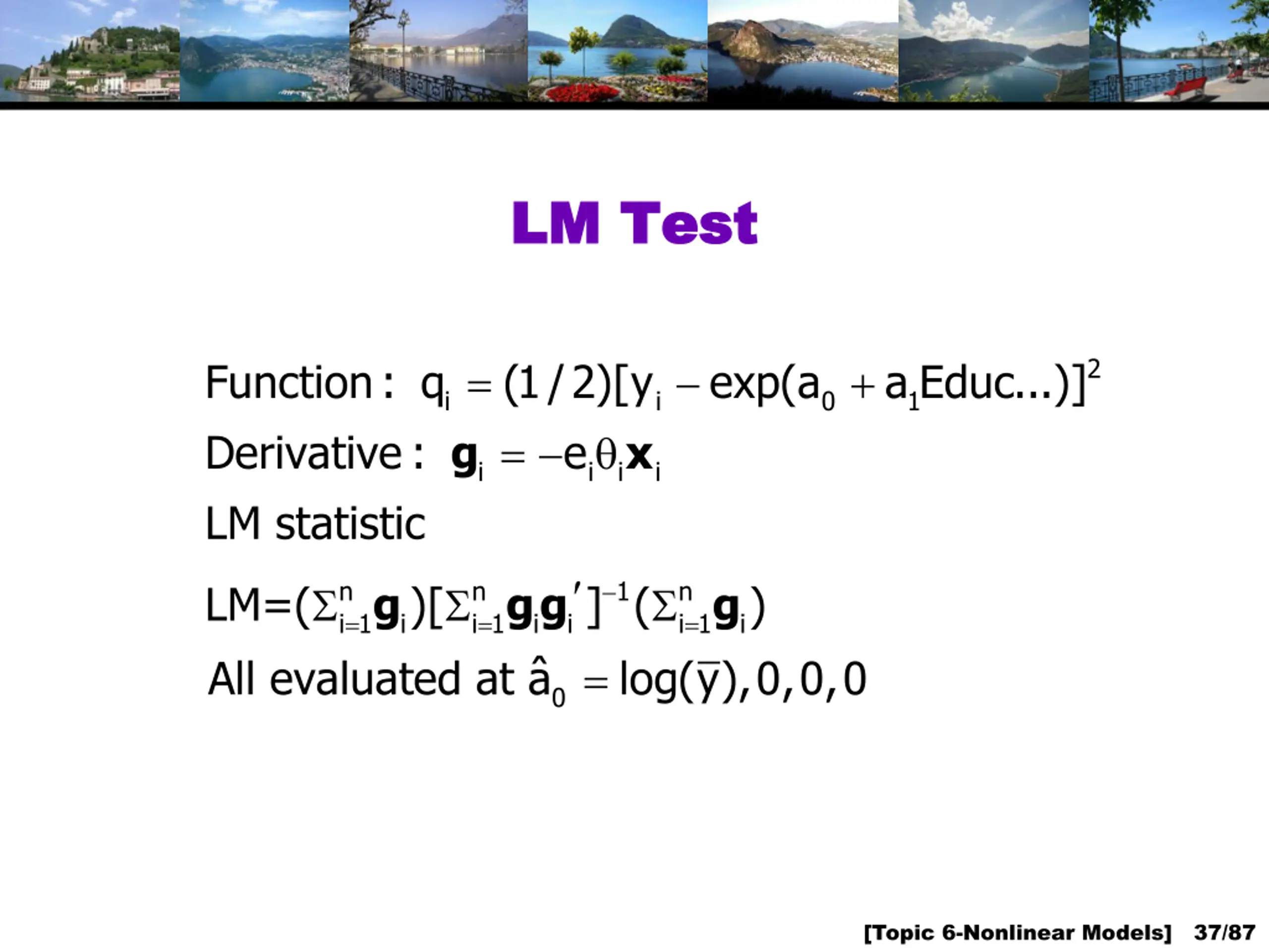 LM Test LM Test 2 = + Function: q Derivative: LM statistic (1/2)[y e = exp(a a Educ...)] i i 0 1 g x i i i i n i 1 = n i 1 = 1 n i 1 = LM=( All evaluated at a g )[ gg ] ( = g ) i i i i log(y),0,0,0 0 [Topic 6-Nonlinear Models] 37/87
