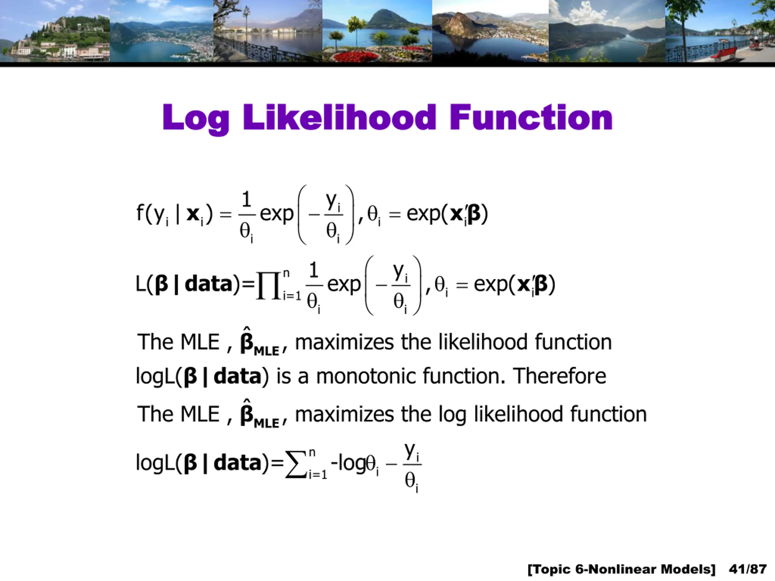 Log Likelihood Function Log Likelihood Function y 1 i = = i f(y | x ) exp , exp( x ) i i i i i y 1 n i = i L( |data )= exp , exp( x ) i i=1 i i The MLE , logL( |data , maximizes the likelihood function ) is a monotonic function. Therefore MLE The MLE , , ma ximizes the log likelihood function y -log MLE n logL( |data )= i i i=1 i [Topic 6-Nonlinear Models] 41/87