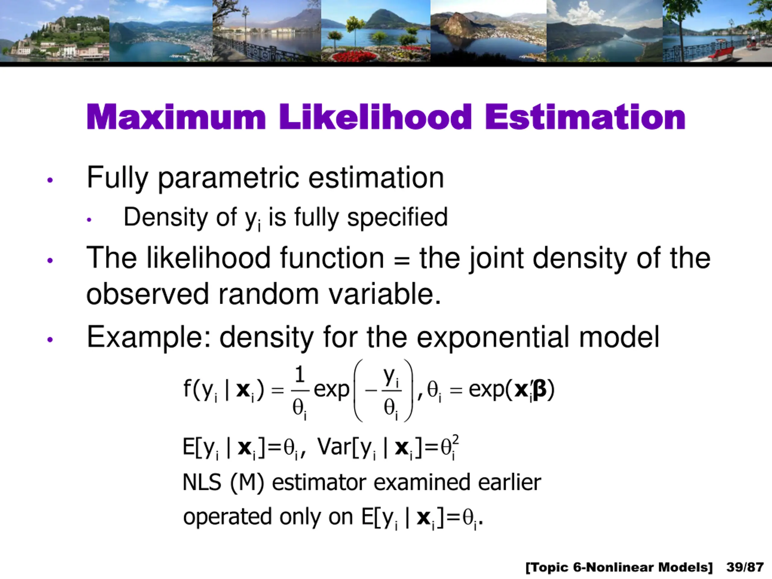Maximum Likelihood Estimation Maximum Likelihood Estimation Fully parametric estimation Density of yi is fully specified The likelihood function = the joint density of the observed random variable. Example: density for the exponential model y 1 f(y | ) exp = x x i = x , exp( x ) i i i i i i 2 i E[y | NLS (M) estimator examined earlier operated only on E[y | ]= , Var[y | ]= i i i i i x ]= . i i i [Topic 6-Nonlinear Models] 39/87