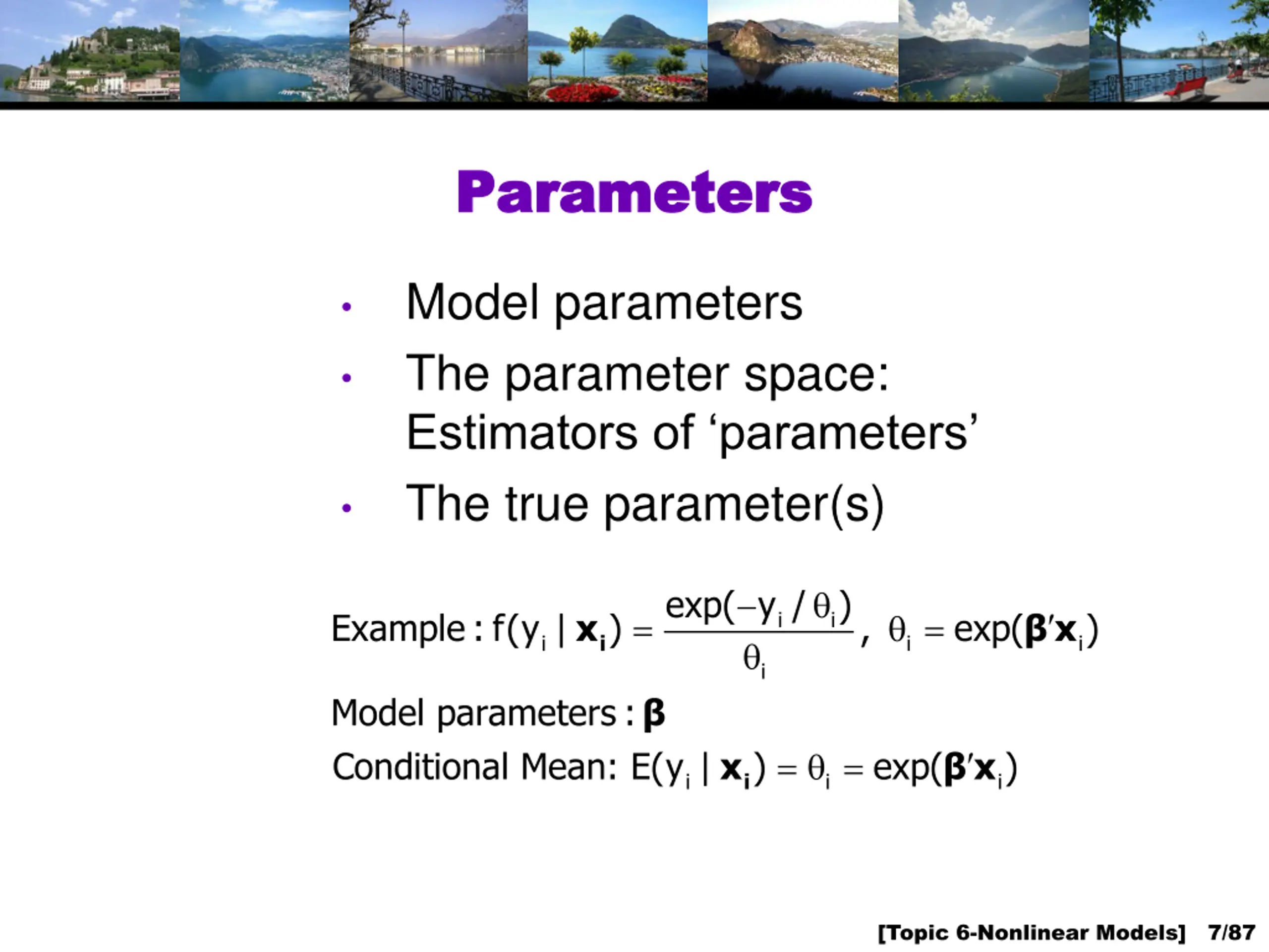 Parameters Parameters Model parameters The parameter space: Estimators of parameters The true parameter(s) exp( y / ) x = = Example: f(y | x ) , exp( x ) i i i i i i i Model parameters : Conditional Mean: E(y | = = ) exp( x ) i i i i [Topic 6-Nonlinear Models] 7/87