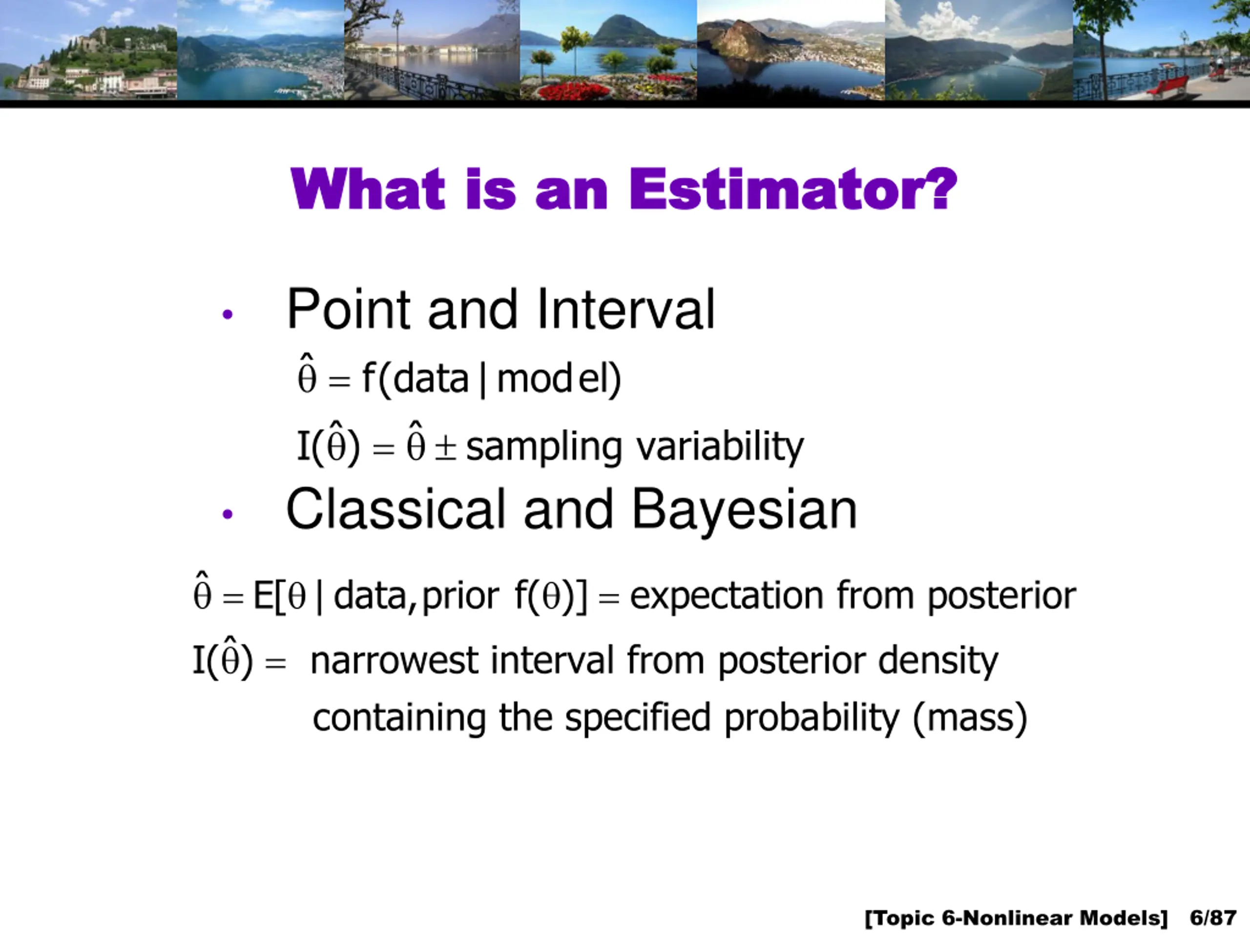What is an Estimator? What is an Estimator? Point and Interval f(data|model) I( ) sampling variability = = Classical and Bayesian = = E[ |data,prior f( )] I( ) narrowest interval from posterior density containing the specified probability (mass) expectation from posterior = [Topic 6-Nonlinear Models] 6/87