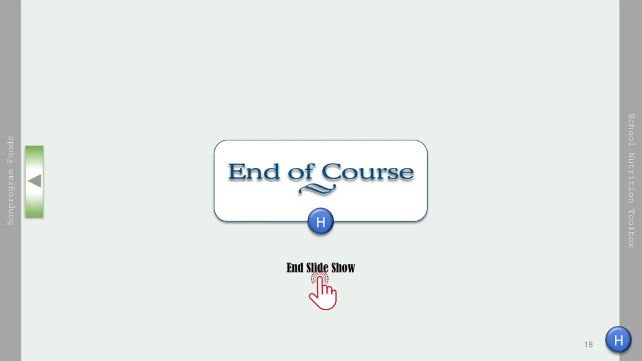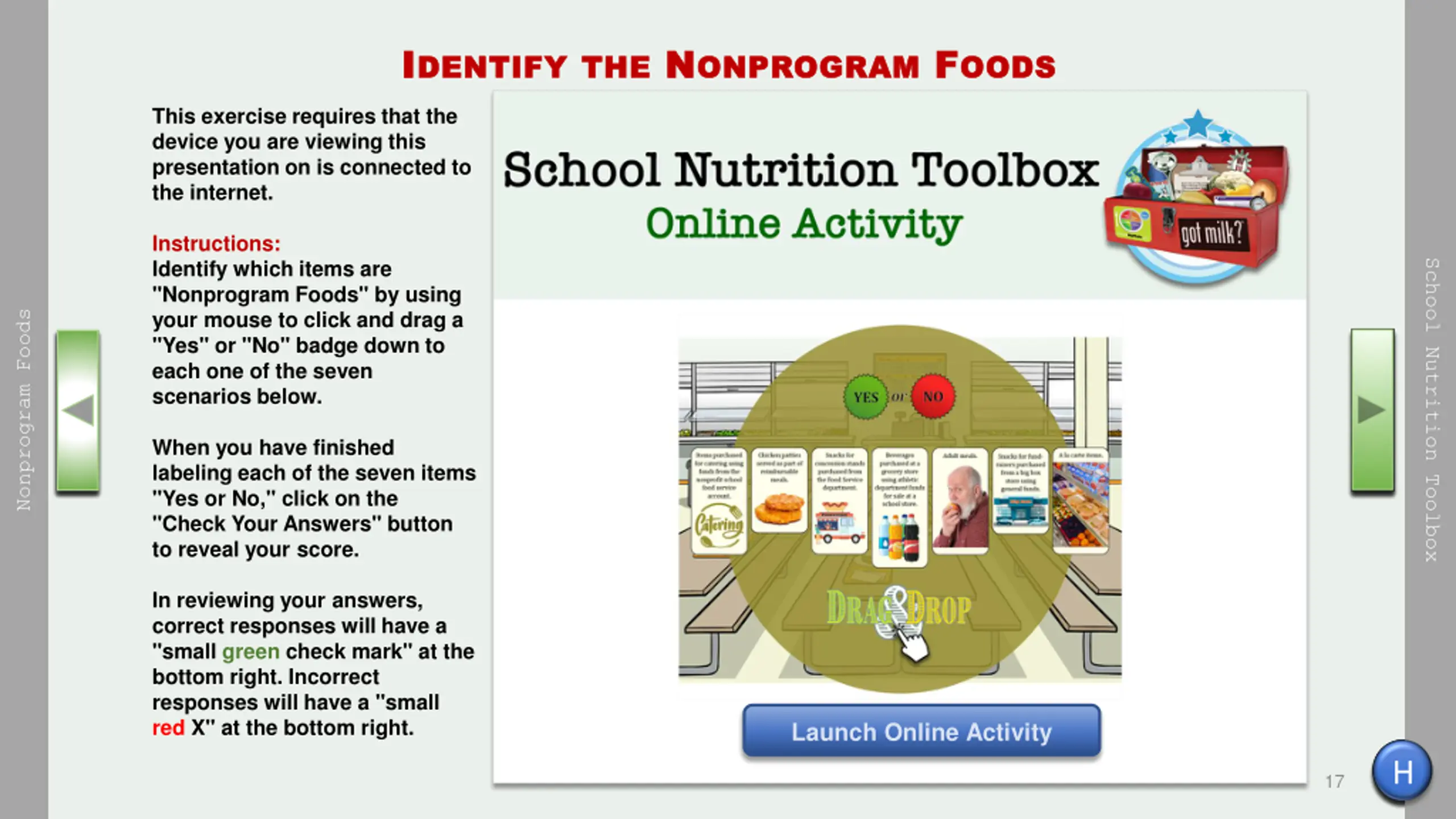 I IDENTIFY DENTIFYTHE THE N NONPROGRAM ONPROGRAM F FOODS OODS This exercise requires that the device you are viewing this presentation on is connected to the internet. Instructions: Identify which items are "Nonprogram Foods" by using your mouse to click and drag a "Yes" or "No" badge down to each one of the seven scenarios below. School Nutrition Toolbox School Nutrition Toolbox School Nutrition Toolbox School Nutrition Toolbox Marketing School Meals Put Course Name Here Put Course Name Here Nonprogram Foods When you have finished labeling each of the seven items "Yes or No," click on the "Check Your Answers" button to reveal your score. In reviewing your answers, correct responses will have a "small green check mark" at the bottom right. Incorrect responses will have a "small red X" at the bottom right. Launch Online Activity Launch Online Activity H H H H H H H H H H H H 17