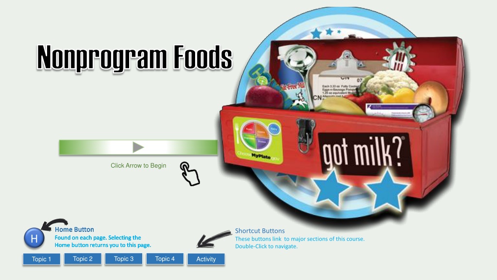 Nonprogram Foods Begin Course Click Arrow to Begin Home Button Home Button Home Button Found on each page. Selecting the Found on each page. Selecting the Found on each page. Selecting the Home Button Found on each page. Selecting the Home button returns you to this page. Home button returns you to this page. Home button returns you to this page. Home button returns you to this page. Shortcut Buttons These buttons link to major sections of this course. Double-Click to navigate. H Topic 2 Topic 3 Topic 4 Topic 1 Activity Topic 2 Topic 3 Topic 4 Topic 1 Activity