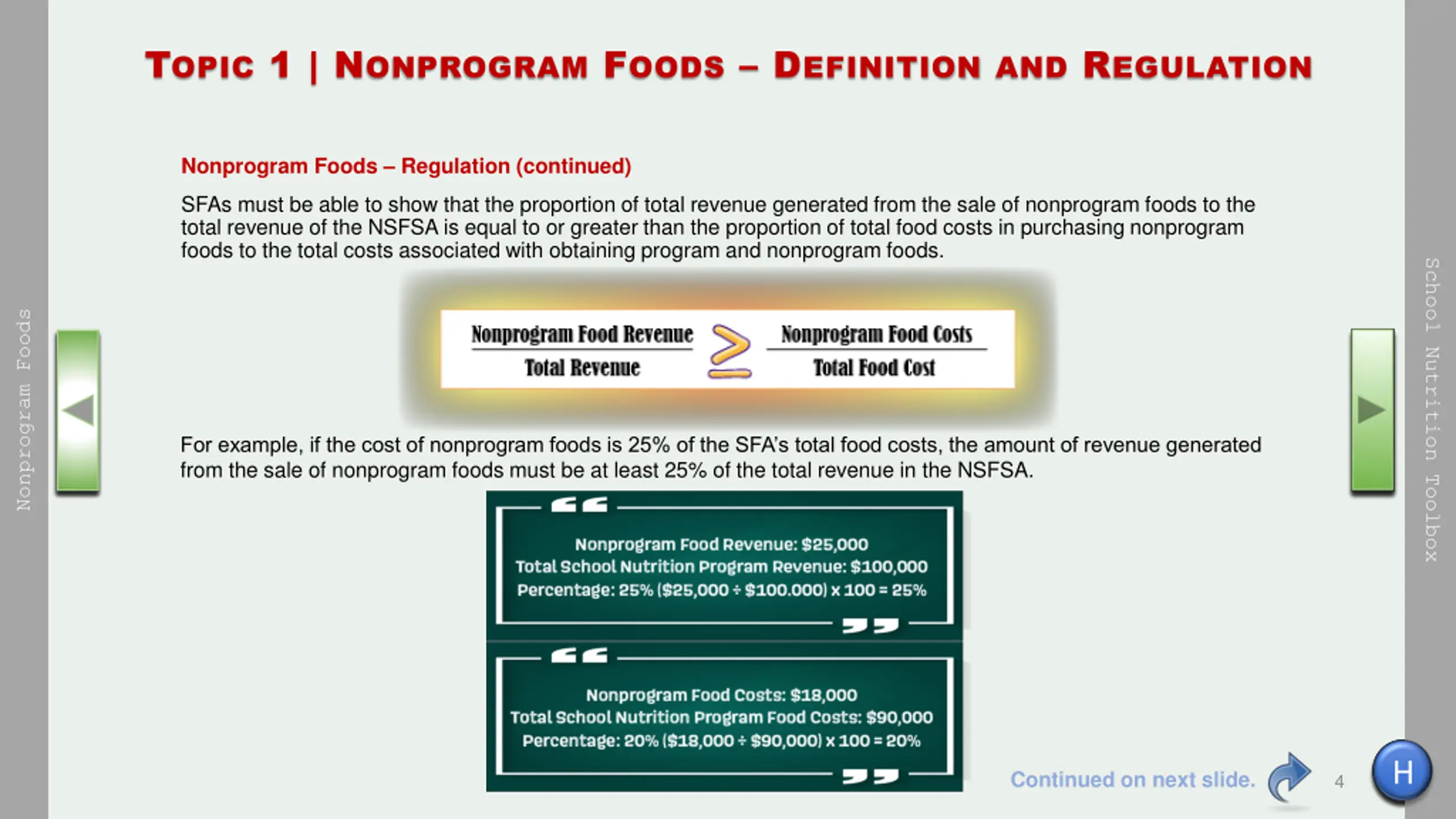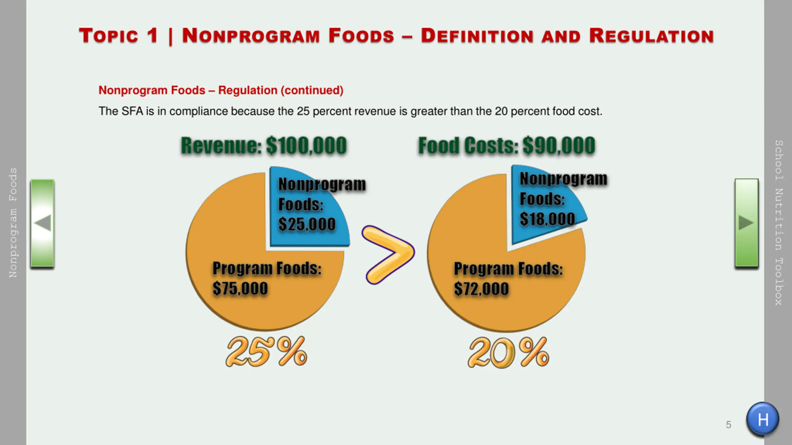 TOPIC 1 | NONPROGRAM FOODS DEFINITIONAND REGULATION Nonprogram Foods Regulation (continued) SFAs must be able to show that the proportion of total revenue generated from the sale of nonprogram foods to the total revenue of the NSFSA is equal to or greater than the proportion of total food costs in purchasing nonprogram foods to the total costs associated with obtaining program and nonprogram foods. School Nutrition Toolbox School Nutrition Toolbox School Nutrition Toolbox School Nutrition Toolbox Marketing School Meals Put Course Name Here Put Course Name Here Nonprogram Foods For example, if the cost of nonprogram foods is 25% of the SFA s total food costs, the amount of revenue generated from the sale of nonprogram foods must be at least 25% of the total revenue in the NSFSA. H H H H H H H H H H H H Continued on next slide. 4