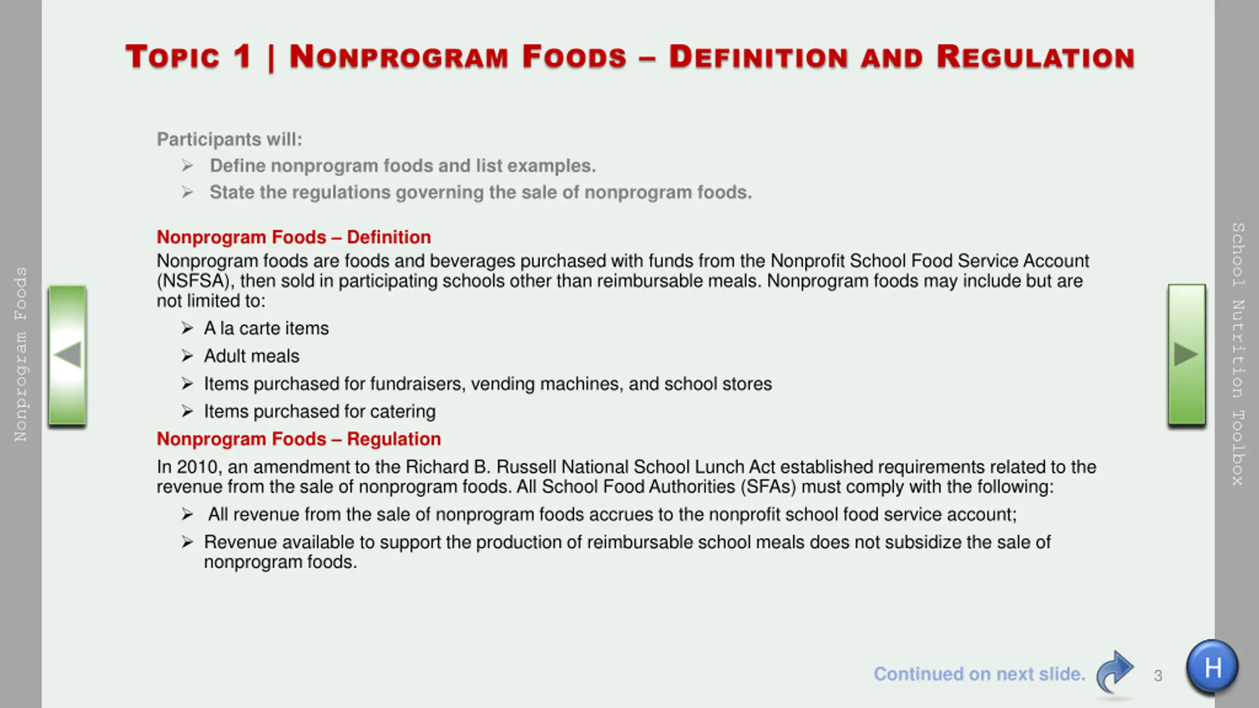 TOPIC 1 | NONPROGRAM FOODS DEFINITIONAND REGULATION Participants will: Define nonprogram foods and list examples. State the regulations governing the sale of nonprogram foods. School Nutrition Toolbox School Nutrition Toolbox School Nutrition Toolbox School Nutrition Toolbox Nonprogram Foods Definition Nonprogram foods are foods and beverages purchased with funds from the Nonprofit School Food Service Account (NSFSA), then sold in participating schools other than reimbursable meals. Nonprogram foods may include but are not limited to: A la carte items Adult meals Items purchased for fundraisers, vending machines, and school stores Items purchased for catering Nonprogram Foods Regulation In 2010, an amendment to the Richard B. Russell National School Lunch Act established requirements related to the revenue from the sale of nonprogram foods. All School Food Authorities (SFAs) must comply with the following: All revenue from the sale of nonprogram foods accrues to the nonprofit school food service account; Revenue available to support the production of reimbursable school meals does not subsidize the sale of nonprogram foods. Marketing School Meals Put Course Name Here Put Course Name Here Nonprogram Foods H H H H H H H H H H H H Continued on next slide. 3