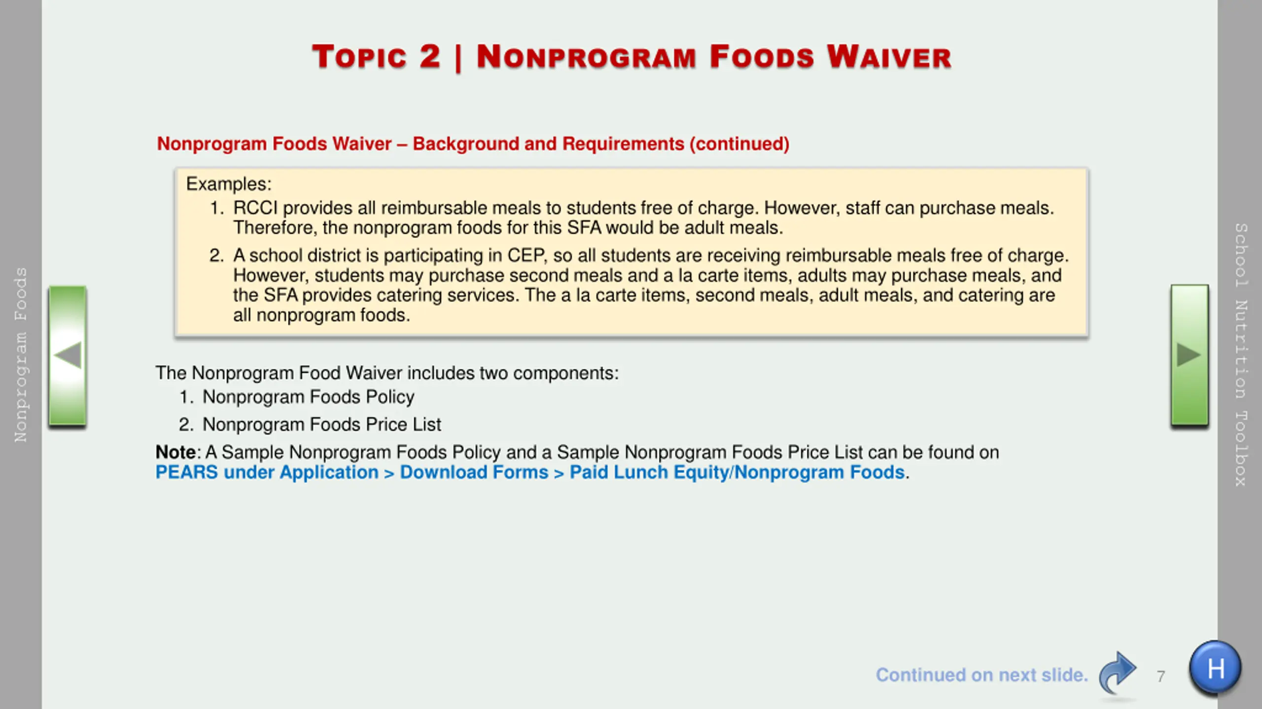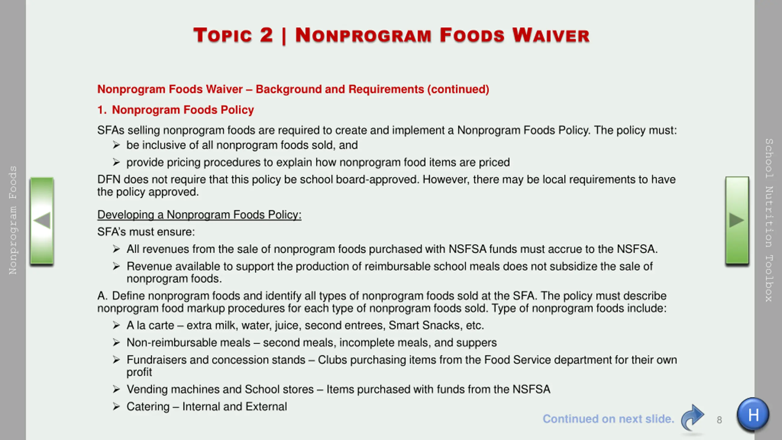 TOPIC 2 | NONPROGRAM FOODS WAIVER Nonprogram Foods Waiver Background and Requirements (continued) Examples: 1. RCCI provides all reimbursable meals to students free of charge. However, staff can purchase meals. Therefore, the nonprogram foods for this SFA would be adult meals. 2. A school district is participating in CEP, so all students are receiving reimbursable meals free of charge. However, students may purchase second meals and a la carte items, adults may purchase meals, and the SFA provides catering services. The a la carte items, second meals, adult meals, and catering are all nonprogram foods. School Nutrition Toolbox School Nutrition Toolbox School Nutrition Toolbox School Nutrition Toolbox Marketing School Meals Put Course Name Here Put Course Name Here Nonprogram Foods The Nonprogram Food Waiver includes two components: 1. Nonprogram Foods Policy 2. Nonprogram Foods Price List Note: A Sample Nonprogram Foods Policy and a Sample Nonprogram Foods Price List can be found on PEARS under Application > Download Forms > Paid Lunch Equity/Nonprogram Foods. H H H H H H H H H H H H Continued on next slide. 7