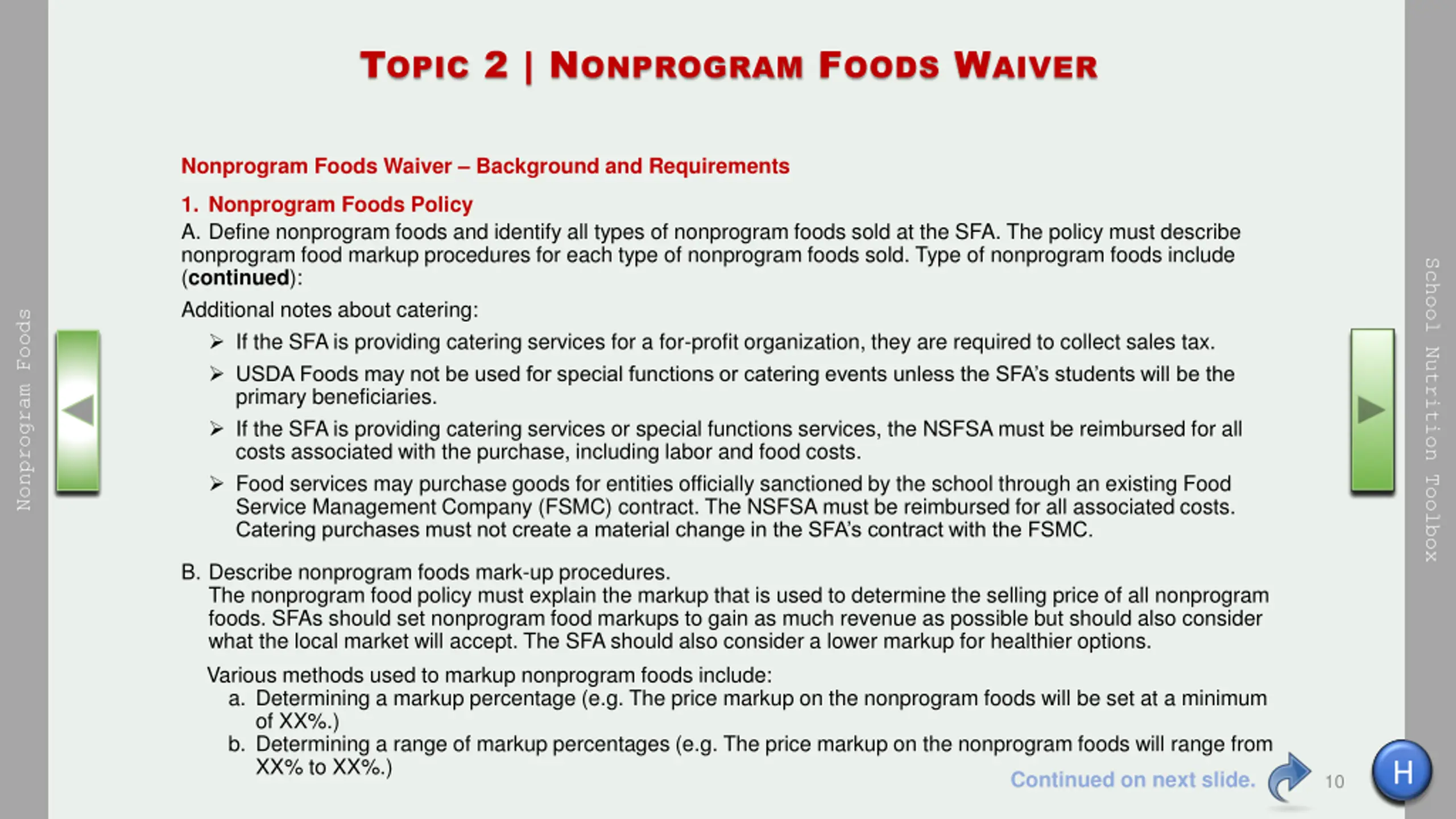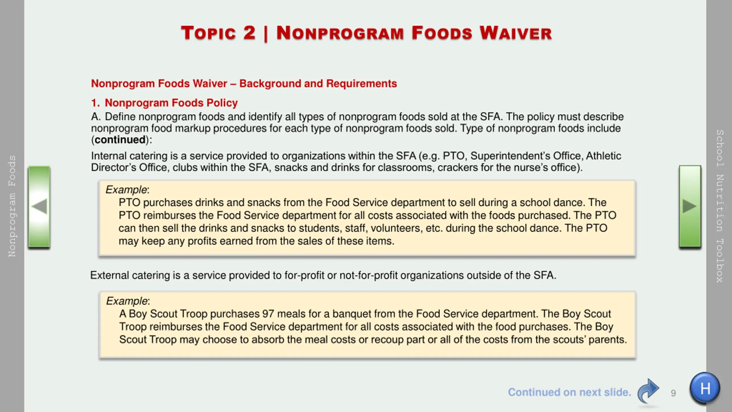 TOPIC 2 | NONPROGRAM FOODS WAIVER Nonprogram Foods Waiver Background and Requirements 1. Nonprogram Foods Policy A. Define nonprogram foods and identify all types of nonprogram foods sold at the SFA. The policy must describe nonprogram food markup procedures for each type of nonprogram foods sold. Type of nonprogram foods include (continued): Internal catering is a service provided to organizations within the SFA (e.g. PTO, Superintendent s Office, Athletic Director s Office, clubs within the SFA, snacks and drinks for classrooms, crackers for the nurse s office). School Nutrition Toolbox School Nutrition Toolbox School Nutrition Toolbox School Nutrition Toolbox Marketing School Meals Put Course Name Here Put Course Name Here Nonprogram Foods Example: PTO purchases drinks and snacks from the Food Service department to sell during a school dance. The PTO reimburses the Food Service department for all costs associated with the foods purchased. The PTO can then sell the drinks and snacks to students, staff, volunteers, etc. during the school dance. The PTO may keep any profits earned from the sales of these items. External catering is a service provided to for-profit or not-for-profit organizations outside of the SFA. Example: A Boy Scout Troop purchases 97 meals for a banquet from the Food Service department. The Boy Scout Troop reimburses the Food Service department for all costs associated with the food purchases. The Boy Scout Troop may choose to absorb the meal costs or recoup part or all of the costs from the scouts parents. H H H H H H H H H H H H Continued on next slide. 9