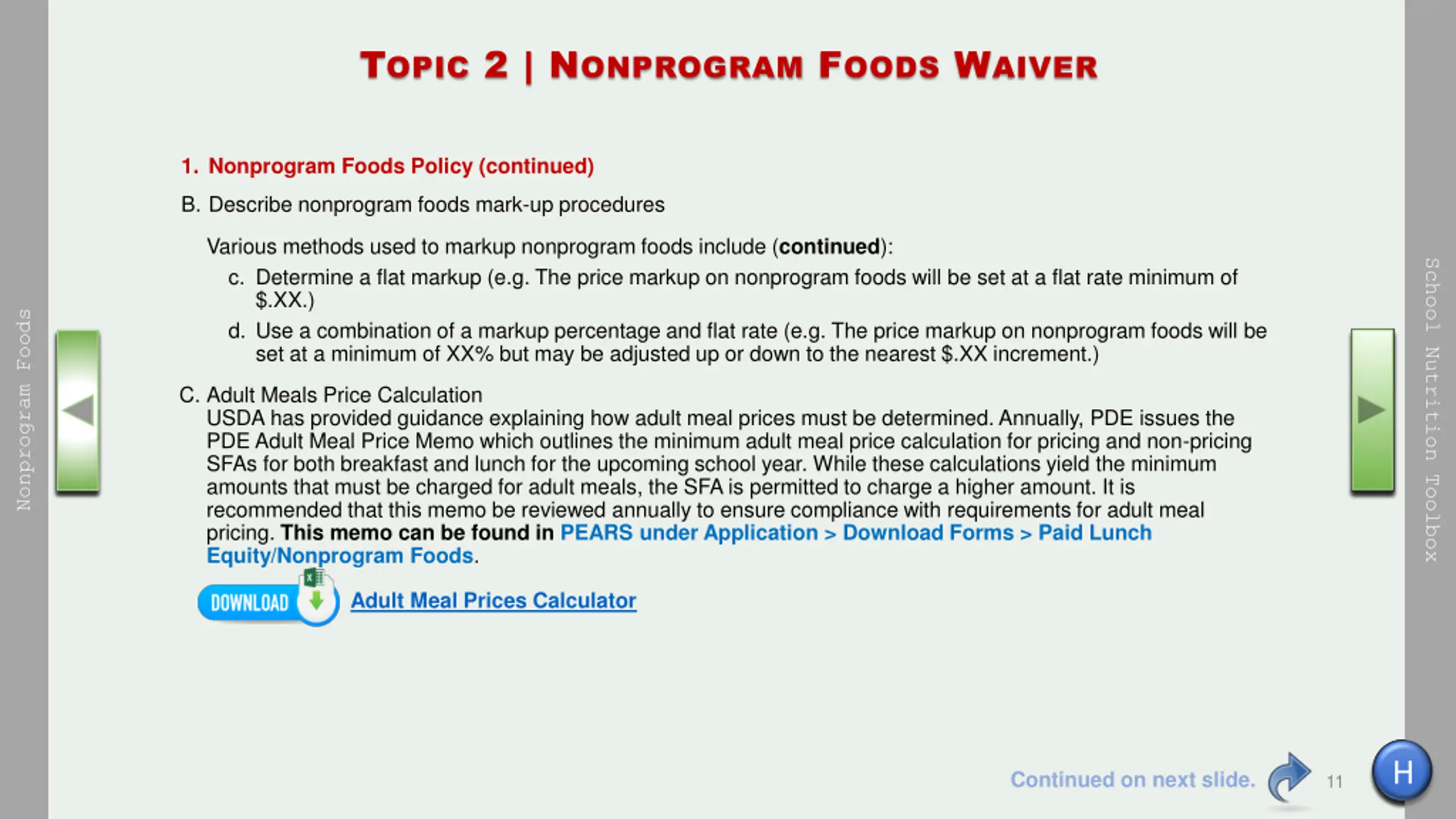 TOPIC 2 | NONPROGRAM FOODS WAIVER 1. Nonprogram Foods Policy (continued) B. Describe nonprogram foods mark-up procedures Various methods used to markup nonprogram foods include (continued): c. Determine a flat markup (e.g. The price markup on nonprogram foods will be set at a flat rate minimum of $.XX.) d. Use a combination of a markup percentage and flat rate (e.g. The price markup on nonprogram foods will be set at a minimum of XX% but may be adjusted up or down to the nearest $.XX increment.) School Nutrition Toolbox School Nutrition Toolbox School Nutrition Toolbox School Nutrition Toolbox Marketing School Meals Put Course Name Here Put Course Name Here Nonprogram Foods C. Adult Meals Price Calculation USDA has provided guidance explaining how adult meal prices must be determined. Annually, PDE issues the PDE Adult Meal Price Memo which outlines the minimum adult meal price calculation for pricing and non-pricing SFAs for both breakfast and lunch for the upcoming school year. While these calculations yield the minimum amounts that must be charged for adult meals, the SFA is permitted to charge a higher amount. It is recommended that this memo be reviewed annually to ensure compliance with requirements for adult meal pricing. This memo can be found in PEARS under Application > Download Forms > Paid Lunch Equity/Nonprogram Foods. Adult Meal Prices Calculator H H H H H H H H H H H H Continued on next slide. 11