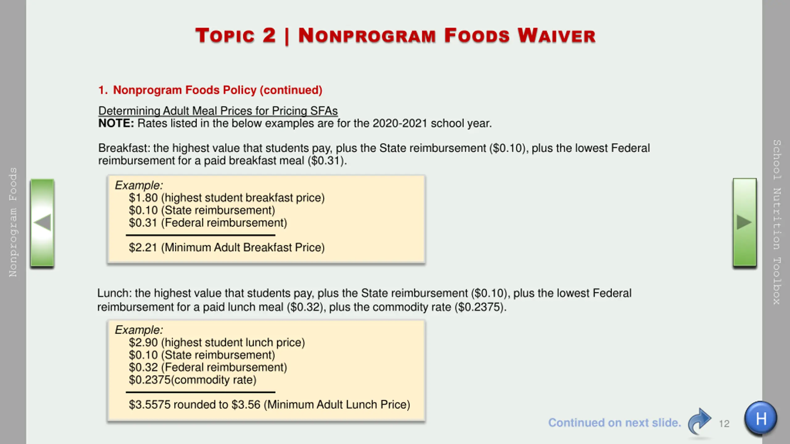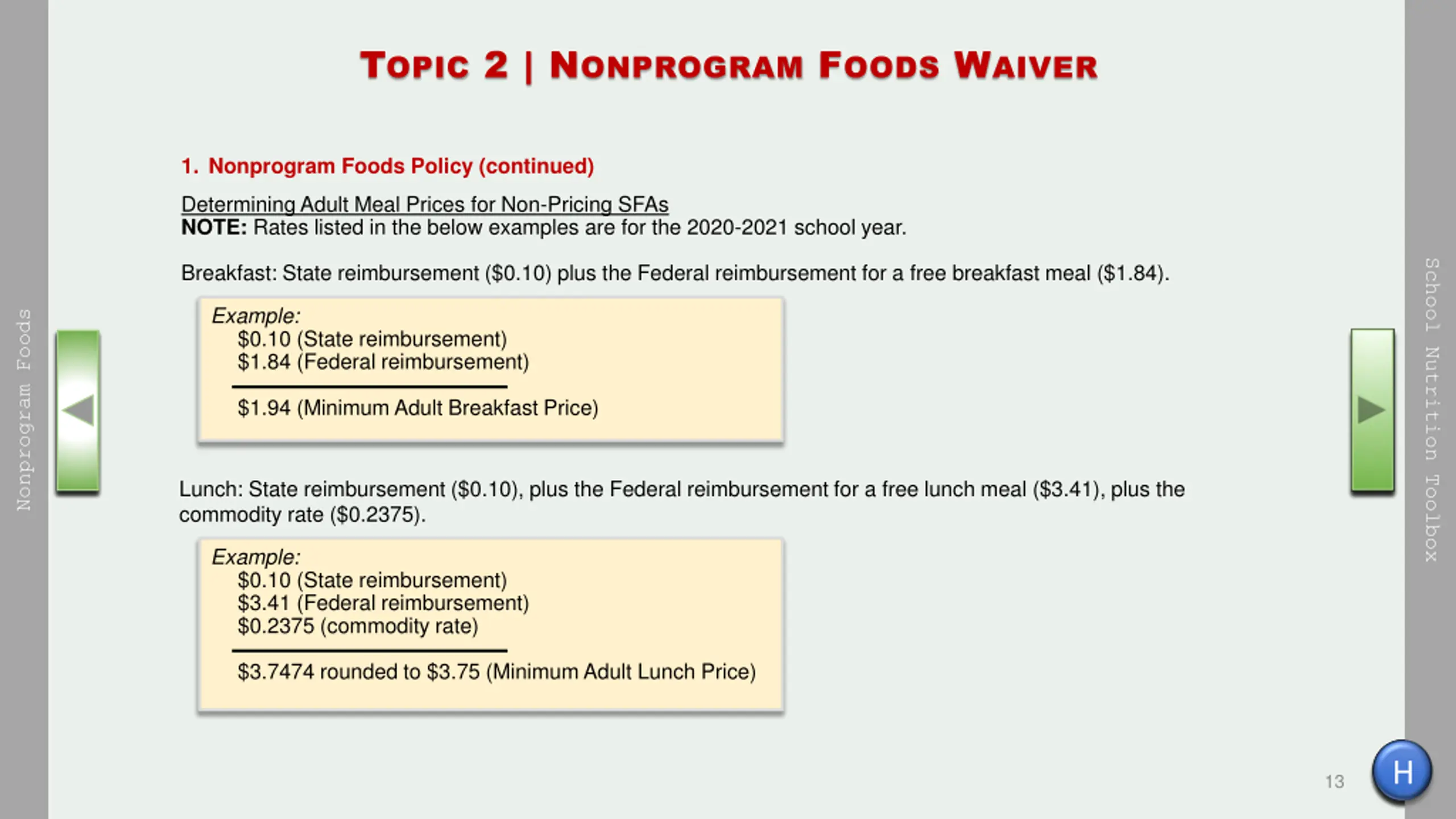 TOPIC 2 | NONPROGRAM FOODS WAIVER 1. Nonprogram Foods Policy (continued) Determining Adult Meal Prices for Pricing SFAs NOTE: Rates listed in the below examples are for the 2020-2021 school year. School Nutrition Toolbox School Nutrition Toolbox School Nutrition Toolbox School Nutrition Toolbox Breakfast: the highest value that students pay, plus the State reimbursement ($0.10), plus the lowest Federal reimbursement for a paid breakfast meal ($0.31). Marketing School Meals Put Course Name Here Put Course Name Here Nonprogram Foods Example: $1.80 (highest student breakfast price) $0.10 (State reimbursement) $0.31 (Federal reimbursement) $2.21 (Minimum Adult Breakfast Price) Lunch: the highest value that students pay, plus the State reimbursement ($0.10), plus the lowest Federal reimbursement for a paid lunch meal ($0.32), plus the commodity rate ($0.2375). Example: $2.90 (highest student lunch price) $0.10 (State reimbursement) $0.32 (Federal reimbursement) $0.2375(commodity rate) $3.5575 rounded to $3.56 (Minimum Adult Lunch Price) H H H H H H H H H H H H Continued on next slide. 12