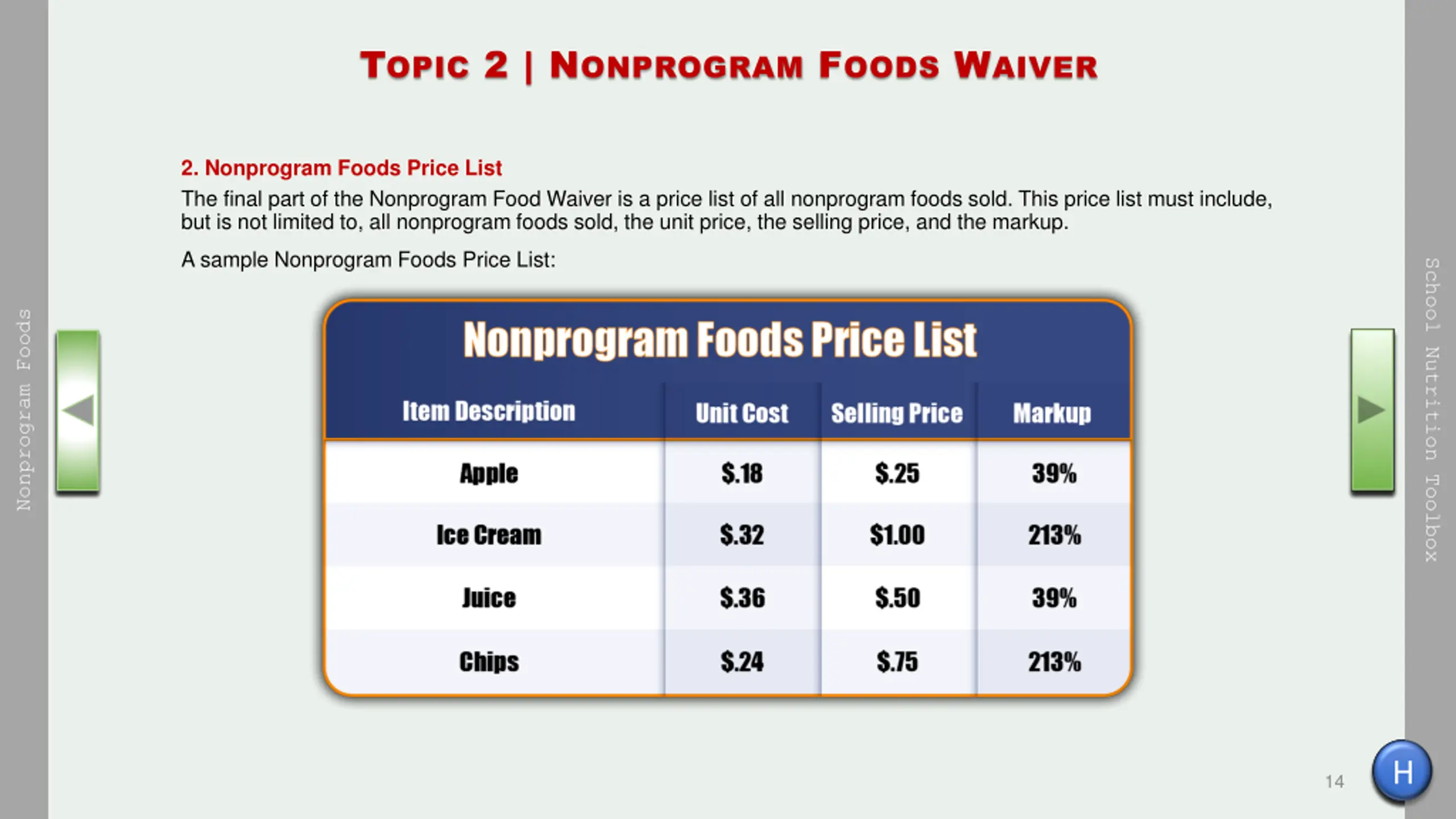 TOPIC 2 | NONPROGRAM FOODS WAIVER 2. Nonprogram Foods Price List The final part of the Nonprogram Food Waiver is a price list of all nonprogram foods sold. This price list must include, but is not limited to, all nonprogram foods sold, the unit price, the selling price, and the markup. A sample Nonprogram Foods Price List: School Nutrition Toolbox School Nutrition Toolbox School Nutrition Toolbox School Nutrition Toolbox Marketing School Meals Put Course Name Here Put Course Name Here Nonprogram Foods H H H H H H H H H H H H 14