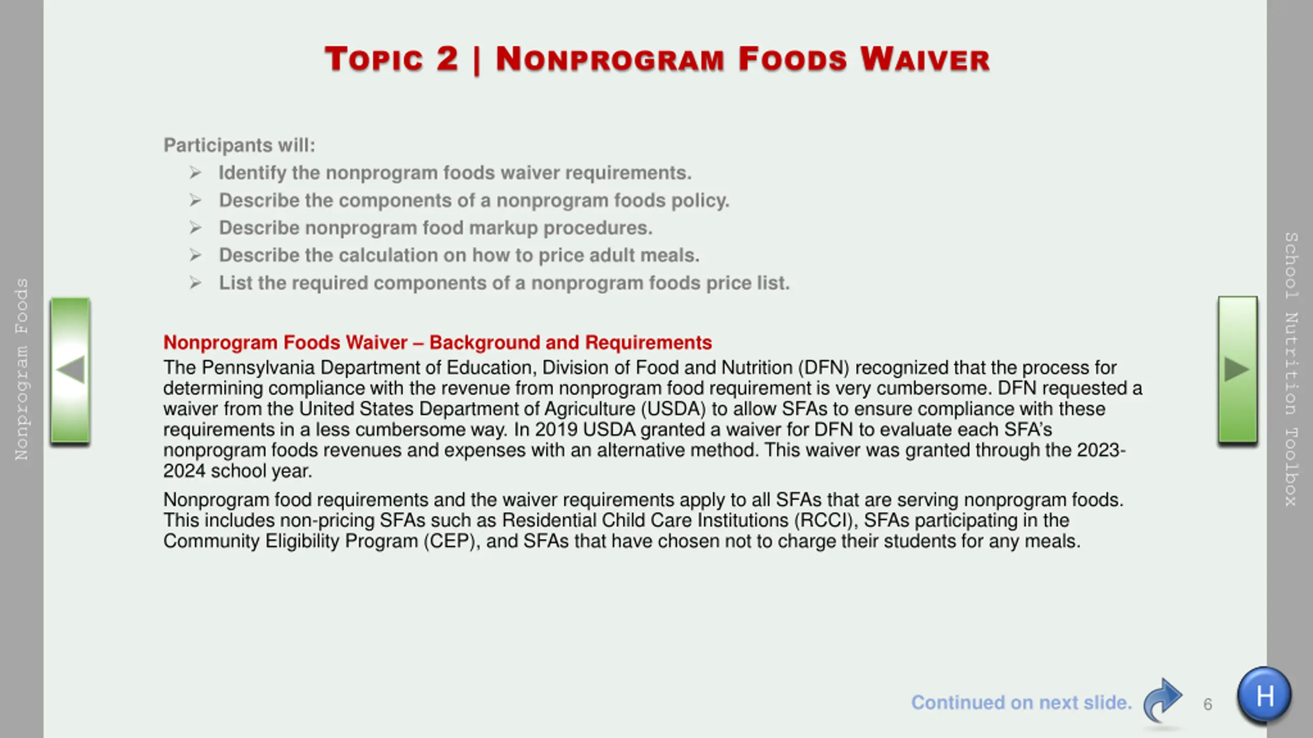 TOPIC 2 | NONPROGRAM FOODS WAIVER Participants will: Identify the nonprogram foods waiver requirements. Describe the components of a nonprogram foods policy. Describe nonprogram food markup procedures. Describe the calculation on how to price adult meals. List the required components of a nonprogram foods price list. School Nutrition Toolbox School Nutrition Toolbox School Nutrition Toolbox School Nutrition Toolbox Marketing School Meals Put Course Name Here Put Course Name Here Nonprogram Foods Nonprogram Foods Waiver Background and Requirements The Pennsylvania Department of Education, Division of Food and Nutrition (DFN) recognized that the process for determining compliance with the revenue from nonprogram food requirement is very cumbersome. DFN requested a waiver from the United States Department of Agriculture (USDA) to allow SFAs to ensure compliance with these requirements in a less cumbersome way. In 2019 USDA granted a waiver for DFN to evaluate each SFA s nonprogram foods revenues and expenses with an alternative method. This waiver was granted through the 2023- 2024 school year. Nonprogram food requirements and the waiver requirements apply to all SFAs that are serving nonprogram foods. This includes non-pricing SFAs such as Residential Child Care Institutions (RCCI), SFAs participating in the Community Eligibility Program (CEP), and SFAs that have chosen not to charge their students for any meals. H H H H H H H H H H H H Continued on next slide. 6