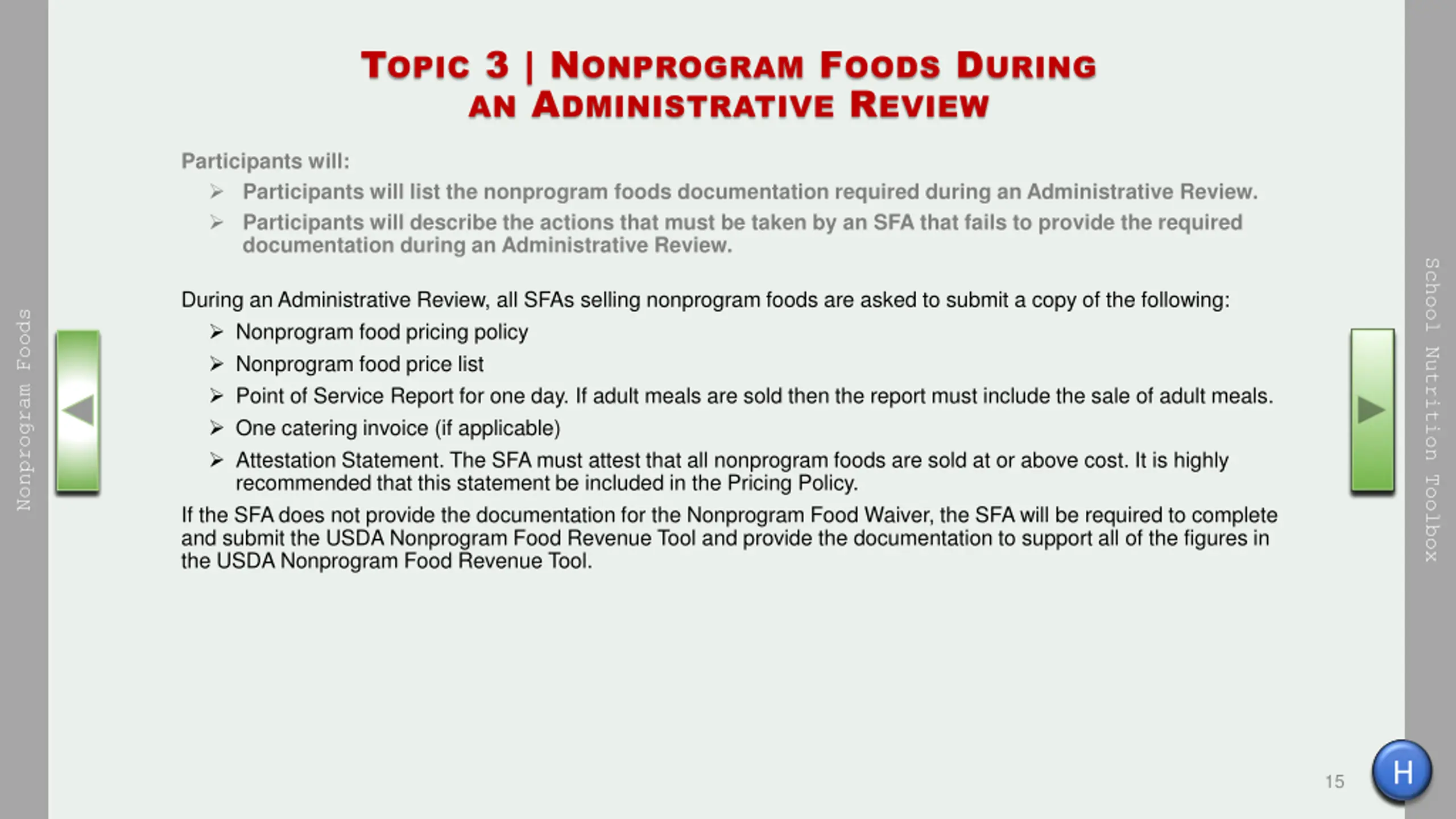 TOPIC 3 | NONPROGRAM FOODS DURING AN ADMINISTRATIVE REVIEW Participants will: Participants will list the nonprogram foods documentation required during an Administrative Review. Participants will describe the actions that must be taken by an SFA that fails to provide the required documentation during an Administrative Review. School Nutrition Toolbox School Nutrition Toolbox School Nutrition Toolbox School Nutrition Toolbox Marketing School Meals Put Course Name Here Put Course Name Here During an Administrative Review, all SFAs selling nonprogram foods are asked to submit a copy of the following: Nonprogram food pricing policy Nonprogram food price list Point of Service Report for one day. If adult meals are sold then the report must include the sale of adult meals. One catering invoice (if applicable) Attestation Statement. The SFA must attest that all nonprogram foods are sold at or above cost. It is highly recommended that this statement be included in the Pricing Policy. If the SFA does not provide the documentation for the Nonprogram Food Waiver, the SFA will be required to complete and submit the USDA Nonprogram Food Revenue Tool and provide the documentation to support all of the figures in the USDA Nonprogram Food Revenue Tool. Nonprogram Foods H H H H H H H H H H H H 15