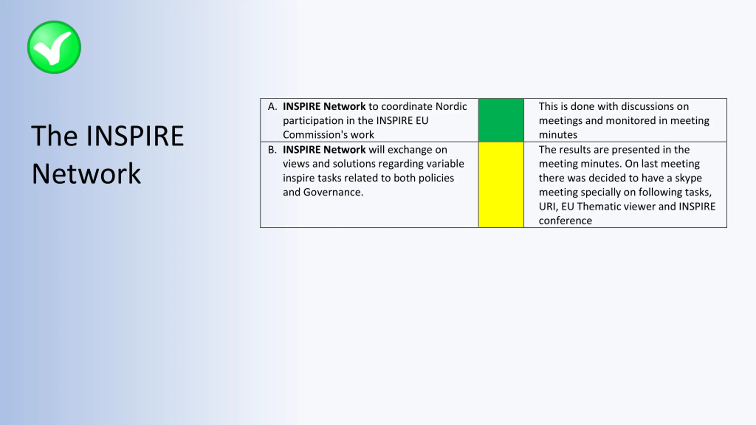 A.INSPIRE Network to coordinate Nordic participation in the INSPIRE EU Commission's work B.INSPIRE Network will exchange on views and solutions regardingvariable inspire tasks related to both policies and Governance. This is done with discussions on meetings and monitored in meeting minutes The results are presented in the meeting minutes. On last meeting there was decided to have a skype meeting specially on following tasks, URI, EU Thematic viewer and INSPIRE conference The INSPIRE Network