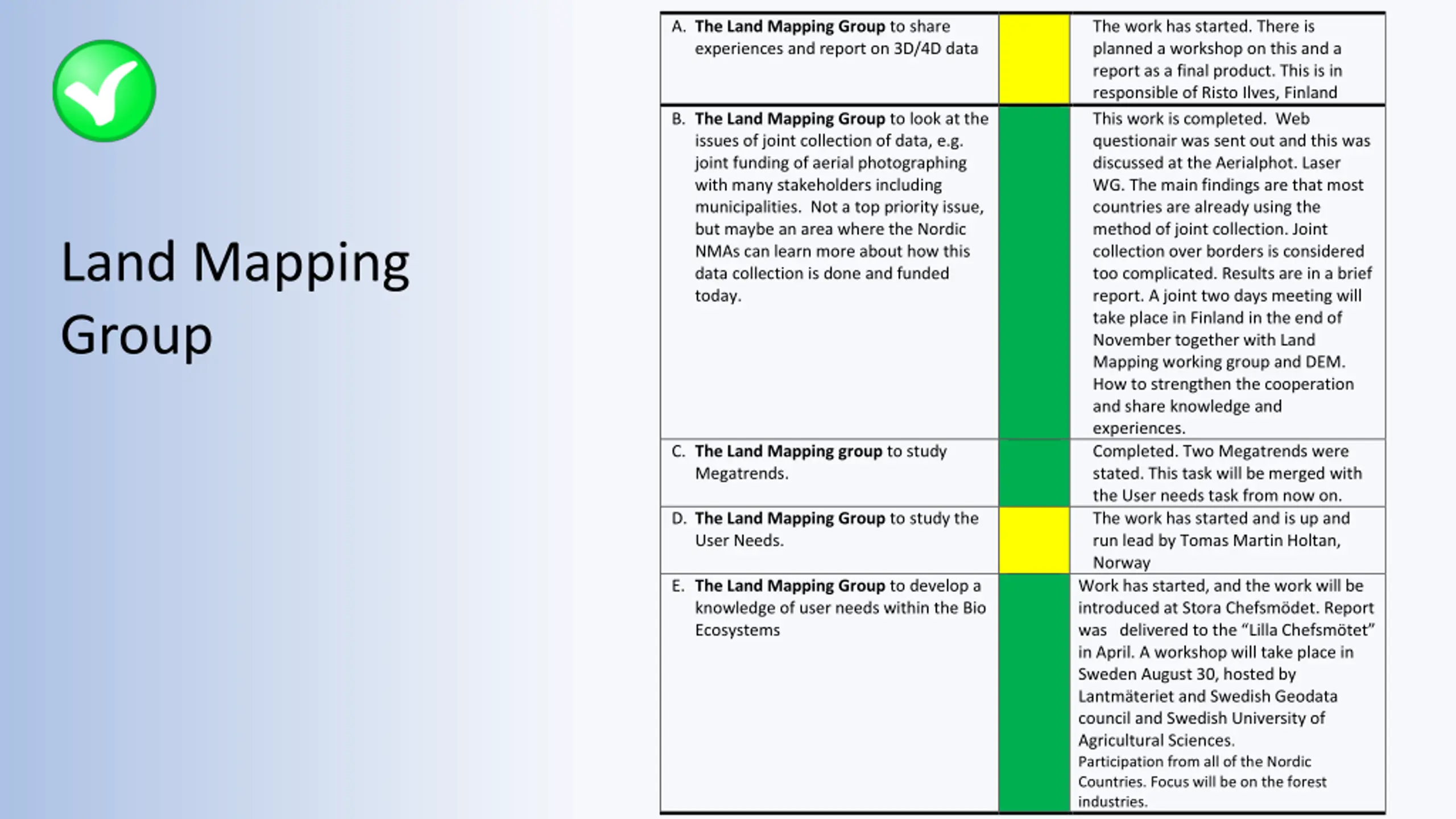 A.The Land Mapping Group to share experiences and report on 3D/4D data The work has started. There is planned a workshop on this and a report as a final product. This is in responsible of Risto Ilves, Finland This work is completed. Web questionair was sent out and this was discussed at the Aerialphot. Laser WG. The main findings are that most countries are already using the method of joint collection. Joint collection over borders is considered too complicated. Results are in a brief report. A joint two days meeting will take place in Finland in the end of November together with Land Mapping working group and DEM. How to strengthen the cooperation and share knowledge and experiences. Completed. Two Megatrends were stated. This task will be merged with the User needs task from now on. The work has started and is up and run lead by Tomas Martin Holtan, Norway Work has started, and the work will be introduced at Stora Chefsm det. Report was delivered to the Lilla Chefsm tet in April. A workshop will take place in Sweden August 30, hosted by Lantm teriet and Swedish Geodata council and Swedish University of Agricultural Sciences. Participation from all of the Nordic Countries. Focus will be on the forest industries. B.The Land Mapping Group to look at the issues of joint collection of data, e.g. joint funding of aerial photographing with many stakeholders including municipalities. Not a top priority issue, but maybe an area where the Nordic NMAs can learn more about how this data collection is done and funded today. Land Mapping Group C.The Land Mapping group to study Megatrends. D.The Land Mapping Group to study the User Needs. E.The Land Mapping Group to develop a knowledge of user needs within the Bio Ecosystems
