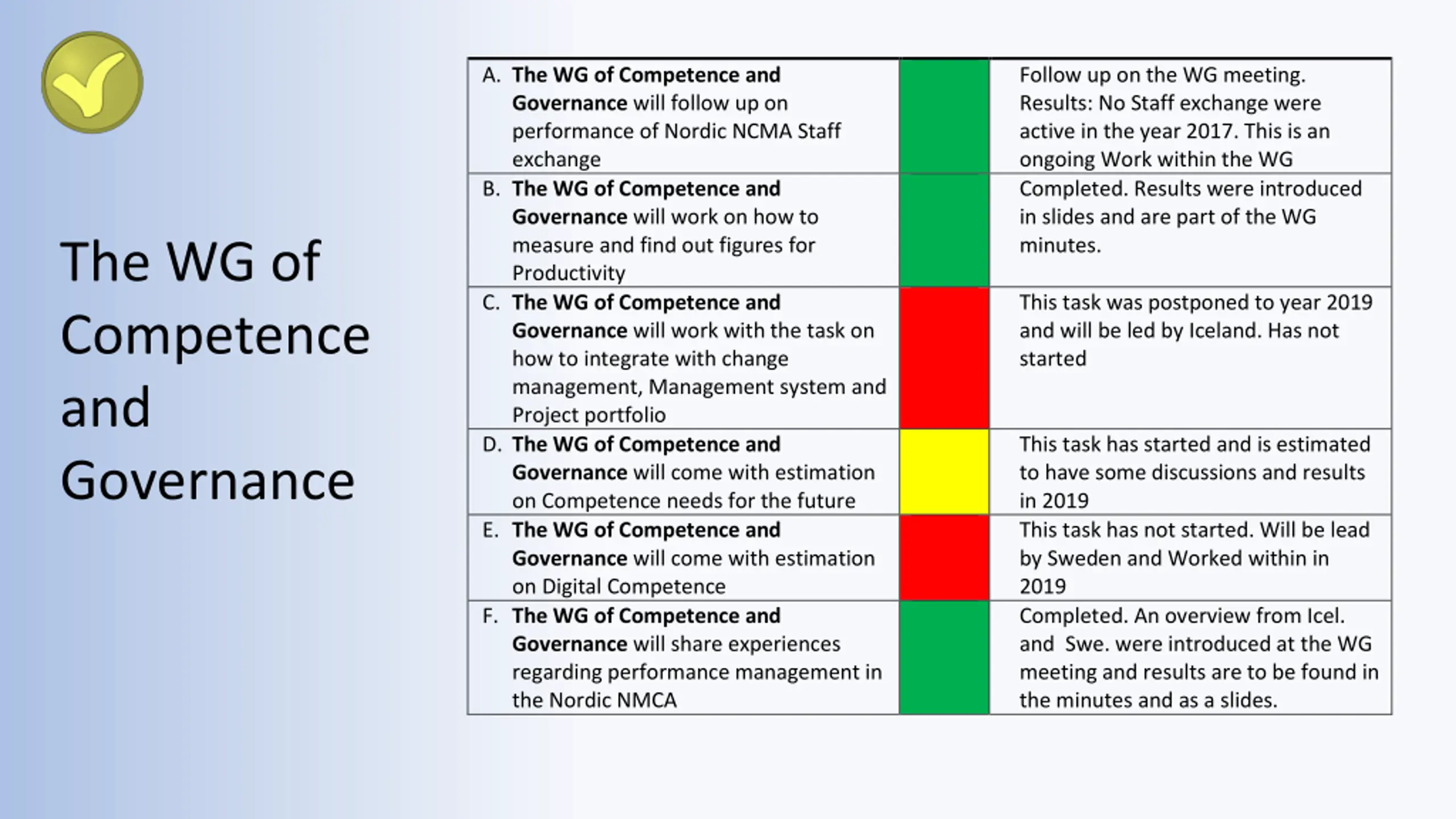 A.The WG of Competence and Governance will follow up on performance of Nordic NCMA Staff exchange B.The WG of Competence and Governance will work on how to measure and find out figures for Productivity C.The WG of Competence and Governance will work with the task on how to integrate with change management, Management system and Project portfolio D.The WG of Competence and Governance will come with estimation on Competence needs for the future E.The WG of Competence and Governance will come with estimation on Digital Competence F.The WG of Competence and Governance will share experiences regarding performance management in the Nordic NMCA Follow up on the WG meeting. Results: No Staff exchange were active in the year 2017. This is an ongoing Work within the WG Completed. Results were introduced in slides and are part of the WG minutes. The WG of Competence and Governance This task was postponed to year 2019 and will be led by Iceland. Has not started This task has started and is estimated to have some discussions and results in 2019 This task has not started. Will be lead by Sweden and Worked within in 2019 Completed. An overview from Icel. and Swe. were introduced at the WG meeting and results are to be found in the minutes and as a slides.