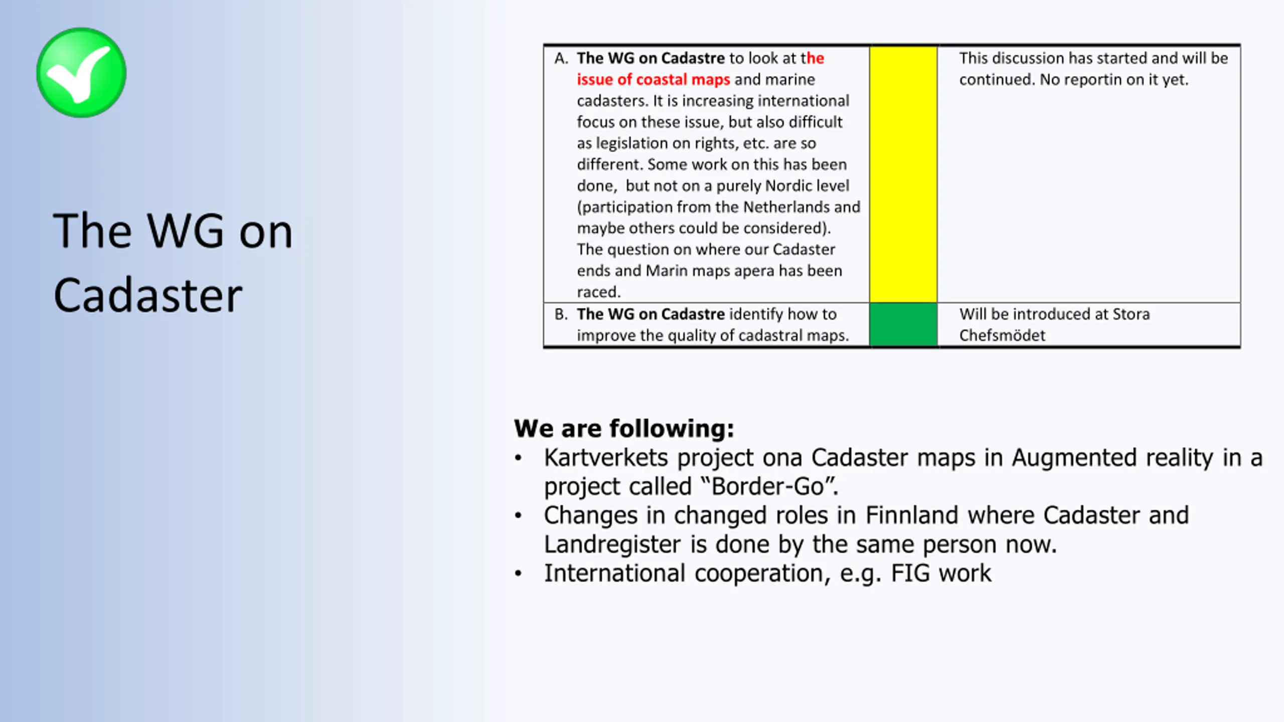 A.The WG on Cadastre to look at the issue of coastal maps and marine cadasters. It is increasing international focus on these issue, but also difficult as legislation on rights, etc. are so different. Some work on this has been done, but not on a purely Nordic level (participation from the Netherlands and maybe others could be considered). The question on where our Cadaster ends and Marin maps apera has been raced. B.The WG on Cadastre identify how to improve the quality of cadastral maps. This discussion has started and will be continued. No reportin on it yet. The WG on Cadaster Will be introduced at Stora Chefsm det We are following: Kartverkets project ona Cadaster maps in Augmented reality in a project called Border-Go . Changes in changed roles in Finnland where Cadaster and Landregister is done by the same person now. International cooperation, e.g. FIG work