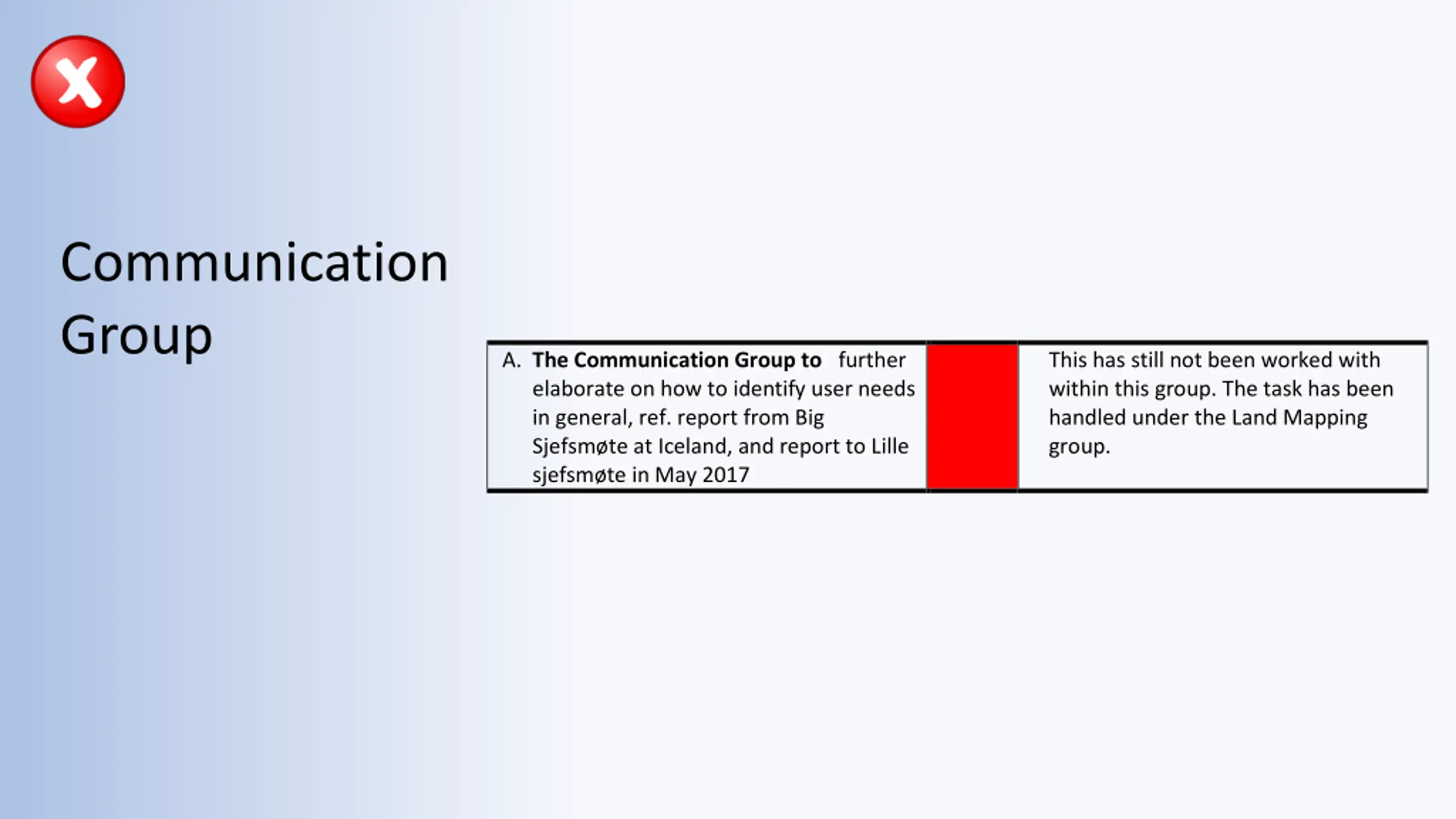 Communication Group A.The Communication Group to further elaborate on how to identify user needs in general, ref. report from Big Sjefsm te at Iceland, and report to Lille sjefsm te in May 2017 This has still not been worked with within this group. The task has been handled under the Land Mapping group.