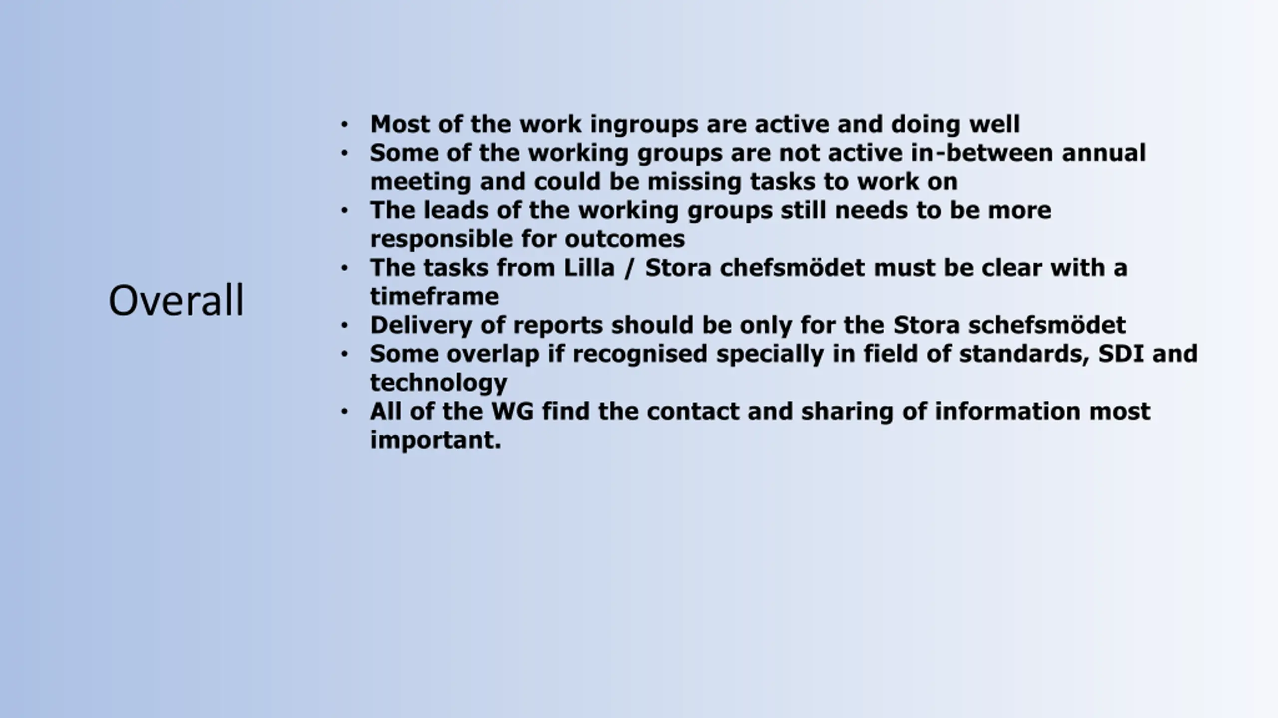 Most of the work ingroups are active and doing well Some of the working groups are not active in-between annual meeting and could be missing tasks to work on The leads of the working groups still needs to be more responsible for outcomes The tasks from Lilla / Stora chefsm det must be clear with a timeframe Delivery of reports should be only for the Stora schefsm det Some overlap if recognised specially in field of standards, SDI and technology All of the WG find the contact and sharing of information most important. Overall