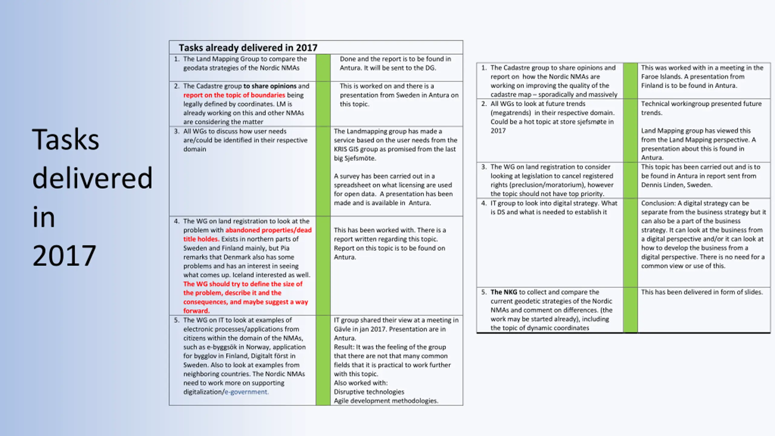 Tasks already delivered in 2017 1.The Land Mapping Group to compare the geodata strategies of the Nordic NMAs Done and the report is to be found in Antura. It will be sent to the DG. This is worked on and there is a presentation from Sweden in Antura on this topic. 1.The Cadastre group to share opinions and report on how the Nordic NMAs are working on improving the quality of the cadastre map sporadically and massively 2.All WGs to look at future trends (megatrends) in their respective domain. Could be a hot topic at store sjefsm te in 2017 This was worked with in a meeting in the Faroe Islands. A presentation from Finland is to be found in Antura. 2.The Cadastre group to share opinions and report on the topic of boundaries being legally defined by coordinates. LM is already working on this and other NMAs are considering the matter 3.All WGs to discuss how user needs are/could be identified in their respective domain Technical workingroup presented future trends. Land Mapping group has viewed this from the Land Mapping perspective. A presentation about this is found in Antura. This topic has been carried out and is to be found in Antura in report sent from Dennis Linden, Sweden. Tasks delivered in 2017 The Landmapping group has made a service based on the user needs from the KRIS GIS group as promised from the last big Sjefsm te. A survey has been carried out in a spreadsheet on what licensing are used for open data. A presentation has been made and is available in Antura. This has been worked with. There is a report written regarding this topic. Report on this topic is to be found on Antura. 3.The WG on land registration to consider looking at legislation to cancel registered rights (preclusion/moratorium), however the topic should not have top priority. 4.IT group to look into digital strategy. What is DS and what is needed to establish it Conclusion: A digital strategy can be separate from the business strategy but it can also be a part of the business strategy. It can look at the business from a digital perspective and/or it can look at how to develop the business from a digital perspective. There is no need for a common view or use of this. 4.The WG on land registration to look at the problem with abandoned properties/dead title holdes. Exists in northern parts of Sweden and Finland mainly, but Pia remarks that Denmark also has some problems and has an interest in seeing what comes up. Iceland interested as well. The WG should try to define the size of the problem, describe it and the consequences, and maybe suggest a way forward. 5.The WG on IT to look at examples of electronic processes/applications from citizens within the domain of the NMAs, such as e-byggs k in Norway, application for bygglov in Finland, Digitalt f rst in Sweden. Also to look at examples from neighboring countries. The Nordic NMAs need to work more on supporting digitalization/e-government. 5.The NKG to collect and compare the current geodetic strategies of the Nordic NMAs and comment on differences. (the work may be started already), including the topic of dynamic coordinates This has been delivered in form of slides. IT group shared their view at a meeting in G vle in jan 2017. Presentation are in Antura. Result: It was the feeling of the group that there are not that many common fields that it is practical to work further with this topic. Also worked with: Disruptive technologies Agile development methodologies. This was worked with in a meeting in the Faroe Islands. A presentation from Finland is to be found in Antura. 6.The Cadastre group to share opinions and report on how the Nordic NMAs are working on improving the quality of the cadastre map sporadically and massively 7.All WGs to look at future trends (megatrends) in their respective domain. Could be a hot topic at store sjefsm te in 2017 Technical workingroup presented future trends. Land Mapping group has viewed this from the Land Mapping perspective. A presentation about this is found in Antura.