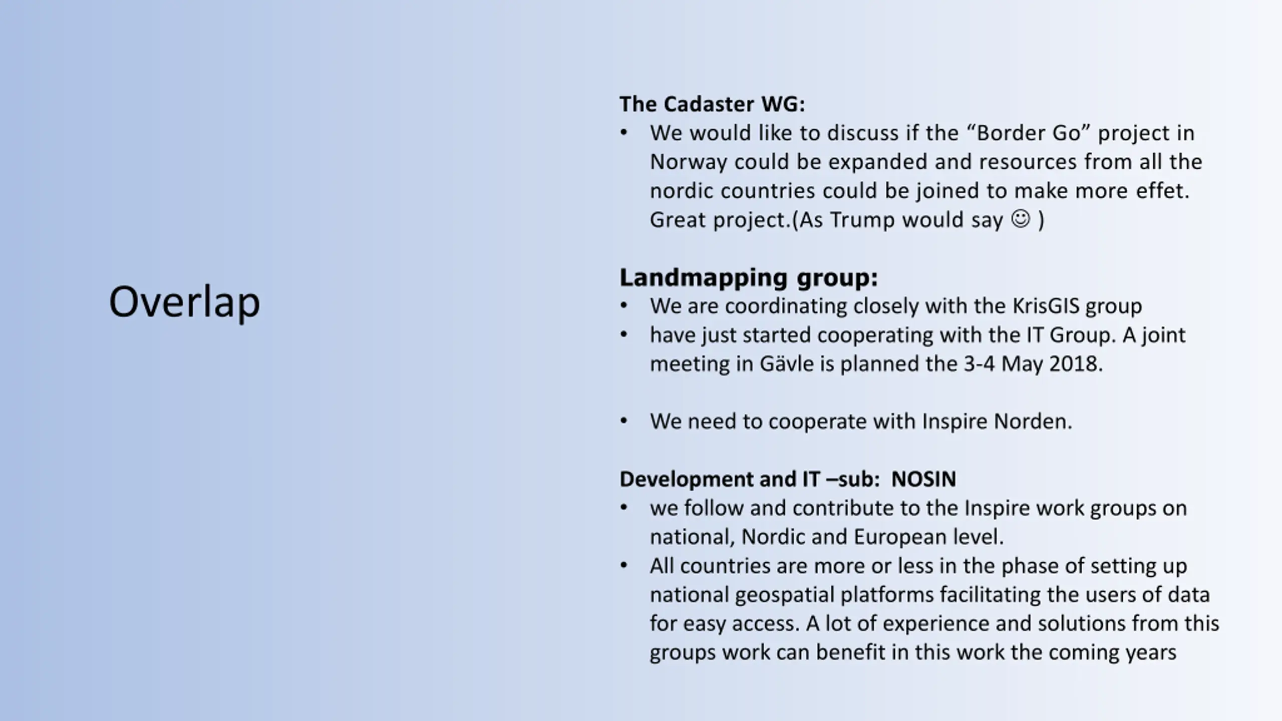 The Cadaster WG: We would like to discuss if the Border Go project in Norway could be expanded and resources from all the nordic countries could be joined to make more effet. Great project.(As Trump would say ) Landmapping group: We are coordinating closely with the KrisGIS group have just started cooperating with the IT Group. A joint meeting in G vle is planned the 3-4 May 2018. Overlap We need to cooperate with Inspire Norden. Development and IT sub: NOSIN we follow and contribute to the Inspire work groups on national, Nordic and European level. All countries are more or less in the phase of setting up national geospatial platforms facilitating the users of data for easy access. A lot of experience and solutions from this groups work can benefit in this work the coming years