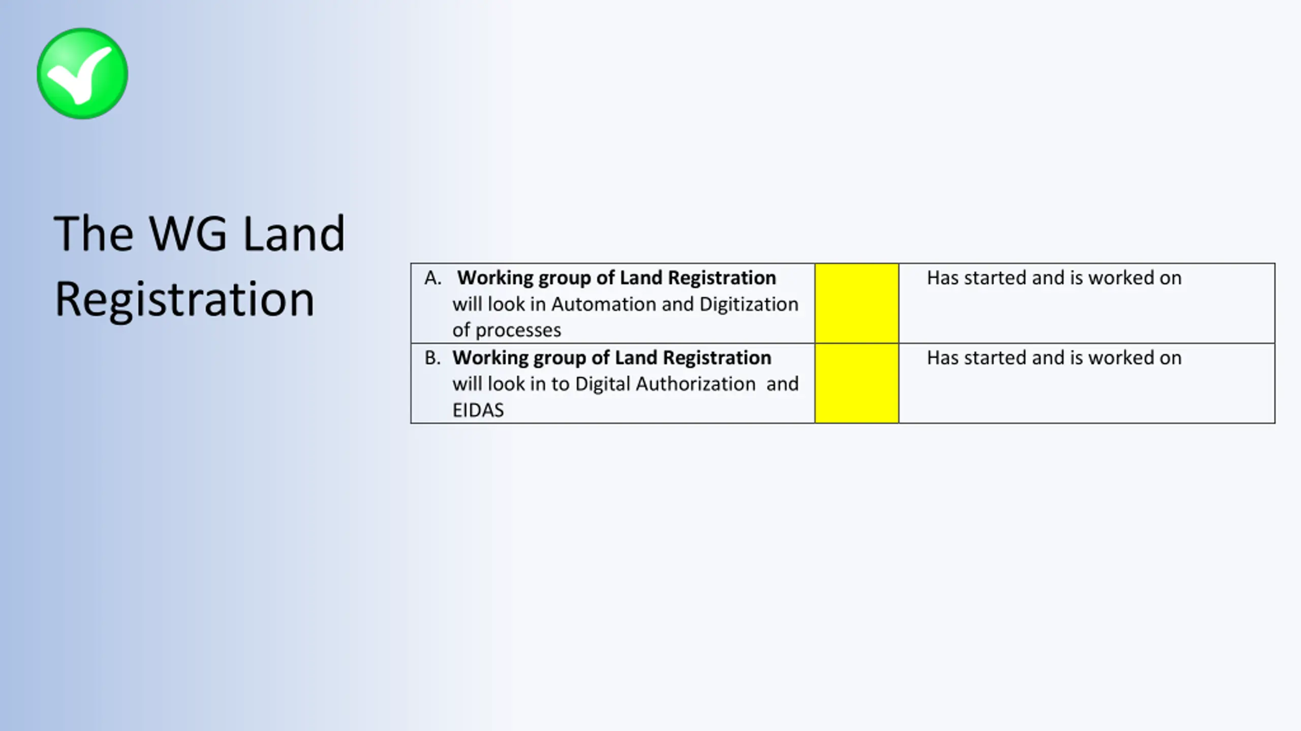 The WG Land Registration A. Working group of Land Registration will look in Automation and Digitization of processes B.Working group of Land Registration will look in to Digital Authorization and EIDAS Has started and is worked on Has started and is worked on