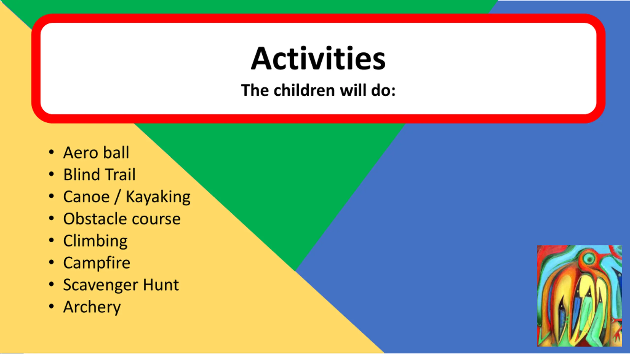 Activities The children will do: Aero ball Blind Trail Canoe / Kayaking Obstacle course Climbing Campfire Scavenger Hunt Archery