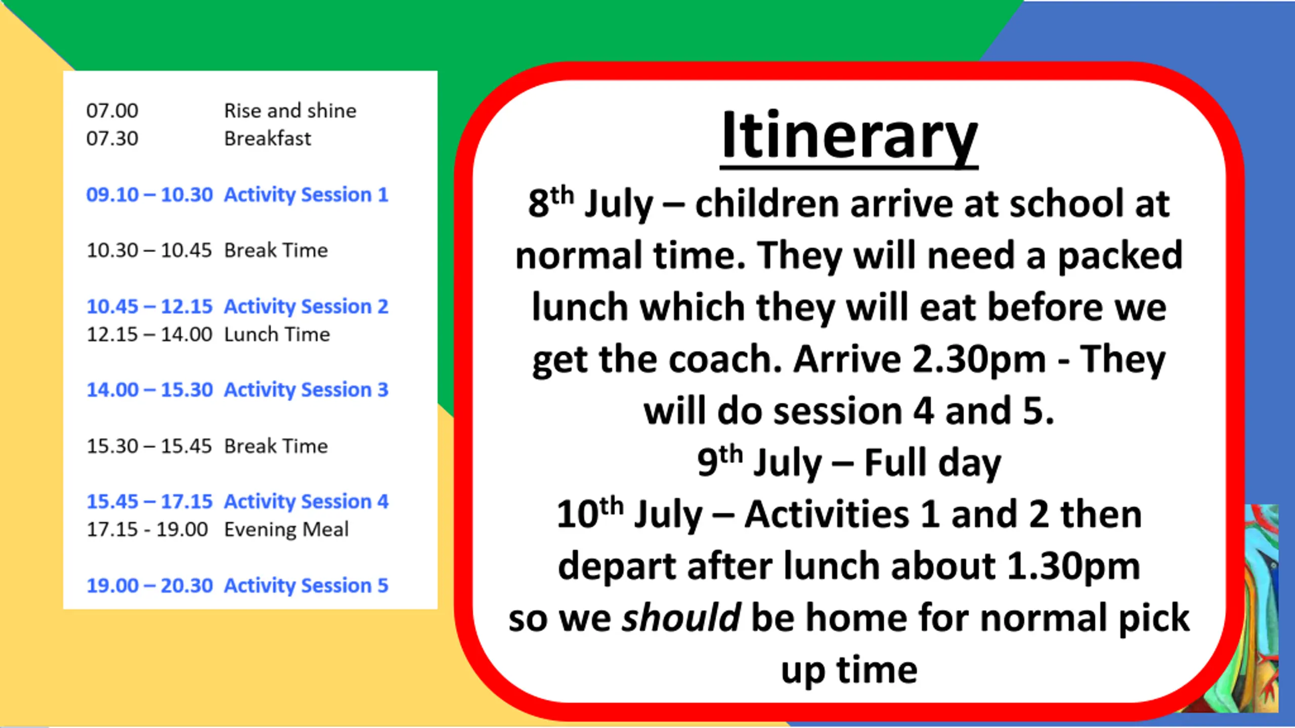 Itinerary 8th July children arrive at school at normal time. They will need a packed lunch which they will eat before we get the coach. Arrive 2.30pm - They will do session 4 and 5. 9th July Full day 10th July Activities 1 and 2 then depart after lunch about 1.30pm so we should be home for normal pick up time