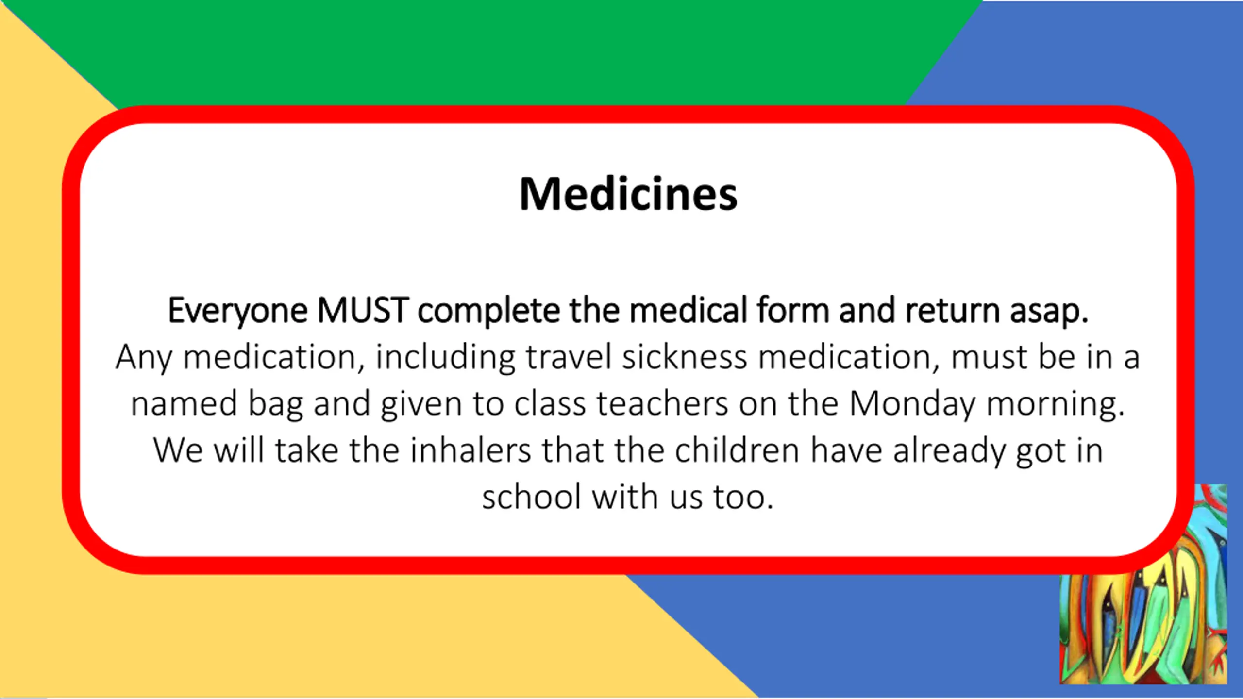 Medicines Everyone MUST complete the medical form and return asap. Everyone MUST complete the medical form and return asap. Any medication, including travel sickness medication, must be in a named bag and given to class teachers on the Monday morning. We will take the inhalers that the children have already got in school with us too.