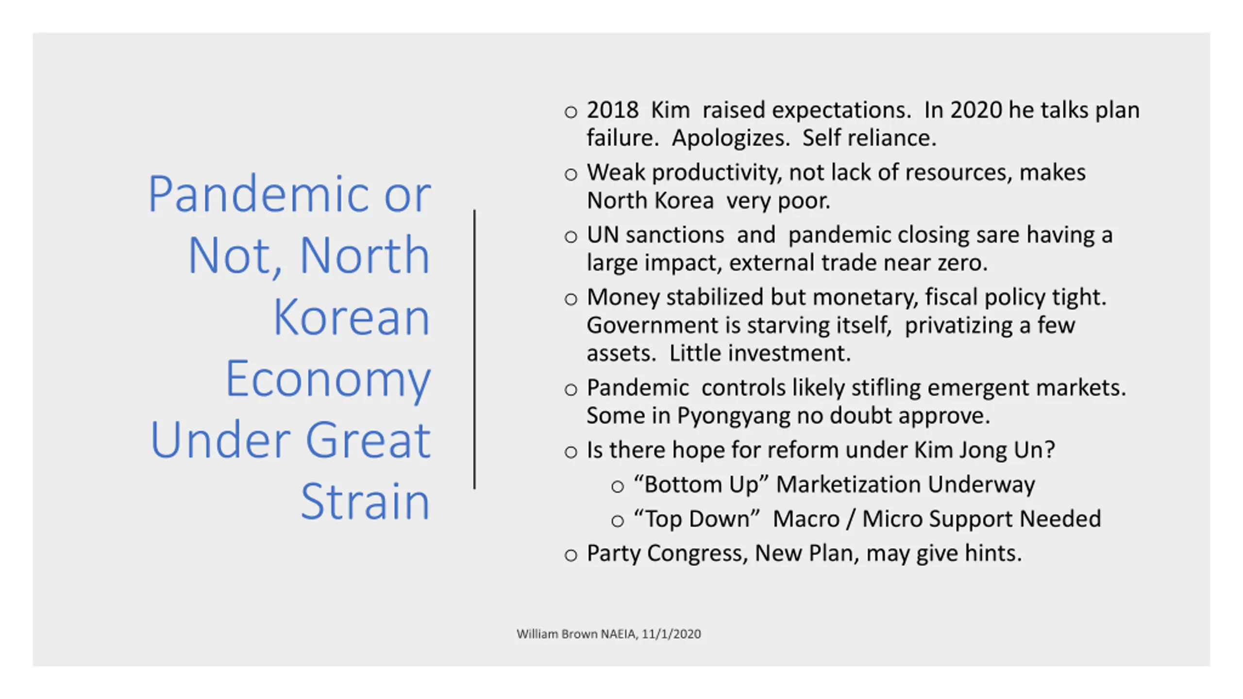 Central bank reduces won supply in parallel with loss of dollars. Little printing of new cash. Few new net loans to state enterprises and state agencies State firms allowed to privatize assets to make ends meet. State agencies raise all kinds of fees to raise funds. (no normal tax system). Allow workers to engage in private income earning work. Theory: Very Tight Monetary, Fiscal Policy Impact is good for inflation but devastating to state investment, employment. Cost of stable won is shrinking , privatization of, state sector. State has very large assets so this can last a long time. Like China. Also, by allowing US dollars and RMB to circulate, real savings vehicles are available for the first time, allowing citizens to save. Reduces current demand. William Brown NAEIA, 11/1/2020