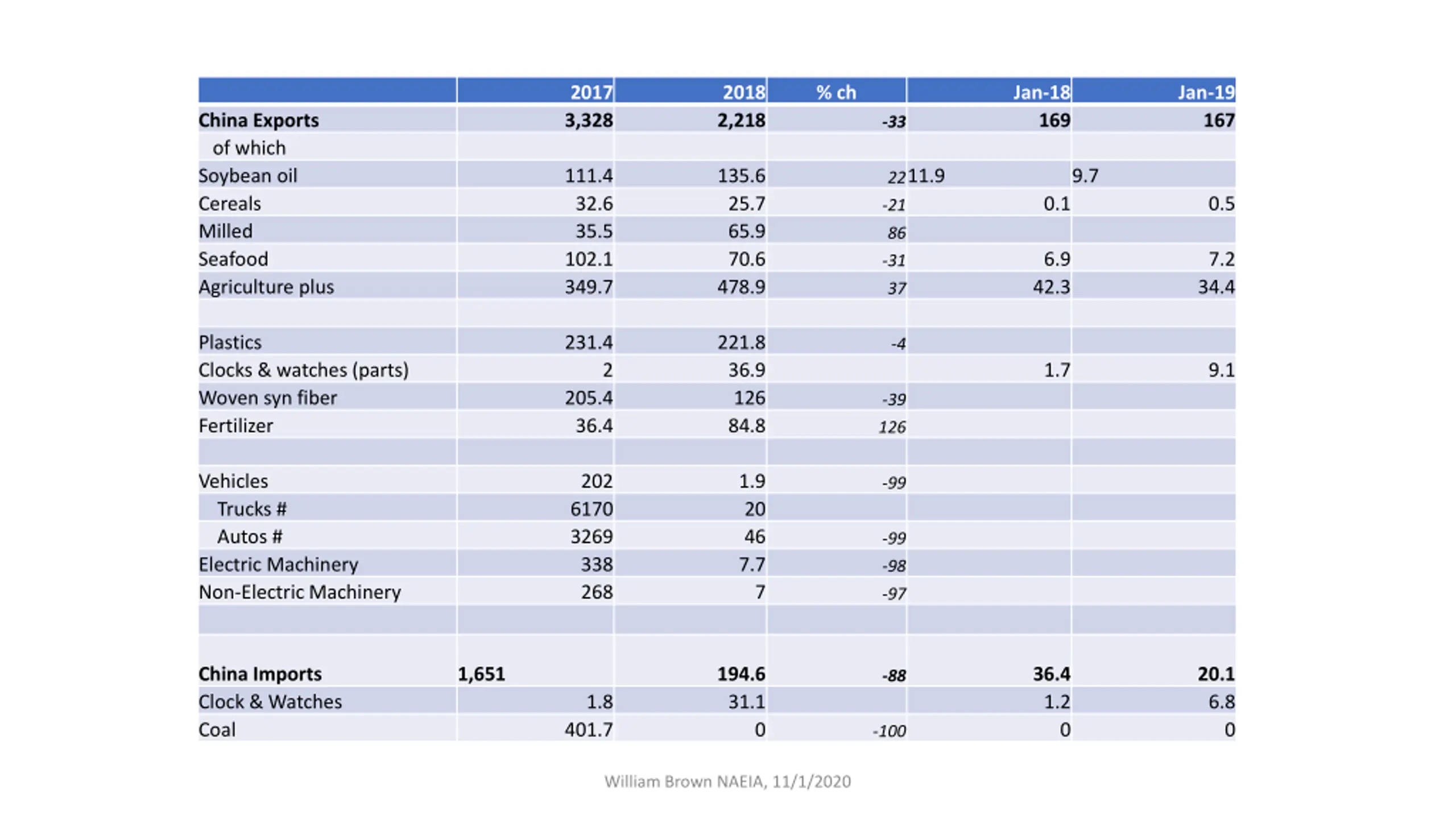 2017 3,328 2018 2,218 % ch Jan-18 169 Jan-19 167 China Exports of which Soybean oil Cereals Milled Seafood Agriculture plus -33 111.4 32.6 35.5 102.1 349.7 135.6 25.7 65.9 70.6 478.9 2211.9 9.7 0.1 0.5 -21 86 6.9 42.3 7.2 34.4 -31 37 Plastics Clocks & watches (parts) Woven syn fiber Fertilizer 231.4 221.8 36.9 126 84.8 -4 2 1.7 9.1 205.4 36.4 -39 126 Vehicles Trucks # Autos # Electric Machinery Non-Electric Machinery 202 6170 3269 338 268 1.9 20 46 7.7 -99 -99 -98 7 -97 China Imports Clock & Watches Coal 1,651 194.6 31.1 36.4 1.2 20.1 6.8 -88 1.8 401.7 0 0 0 -100 William Brown NAEIA, 11/1/2020
