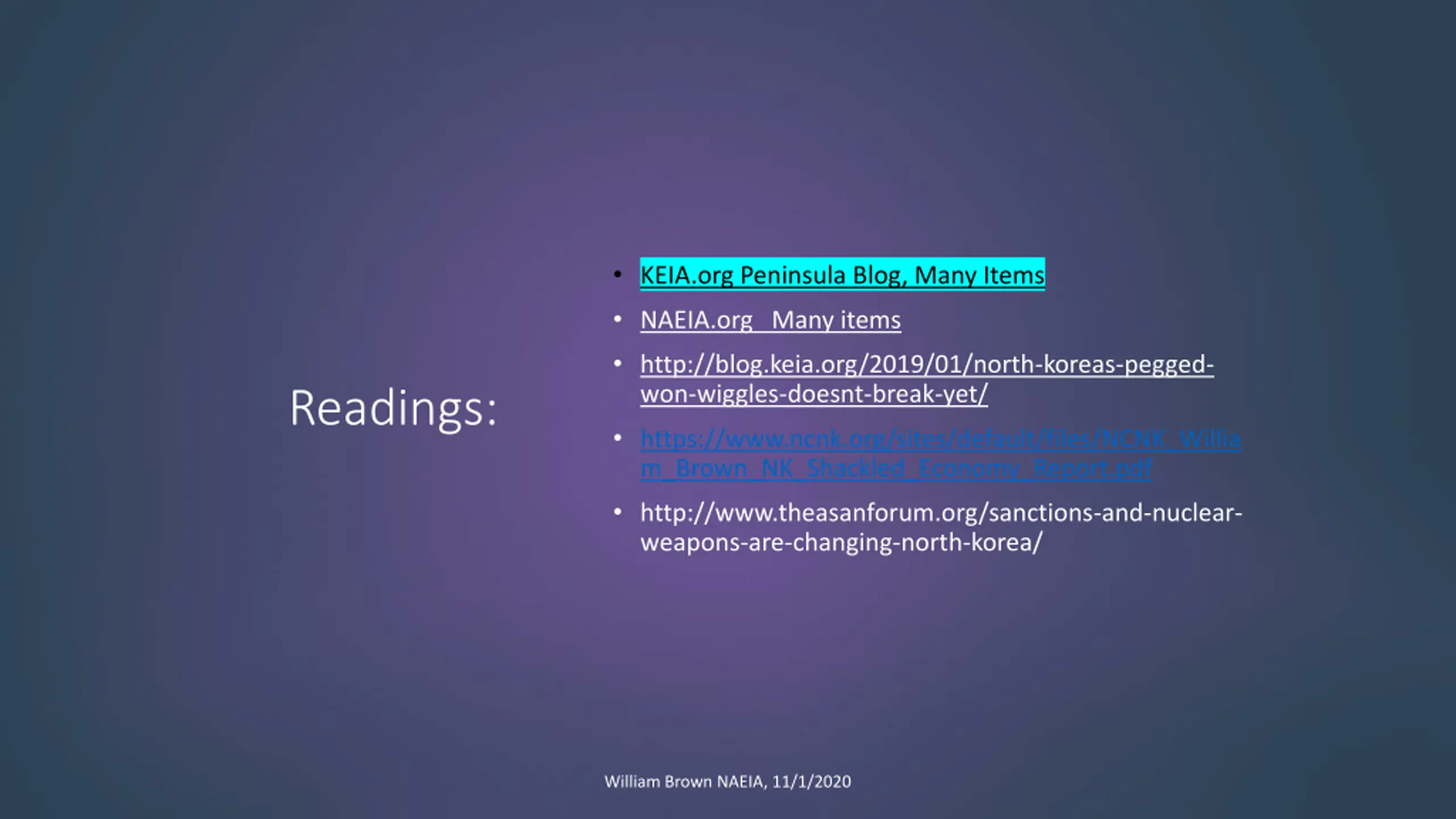 KEIA.org Peninsula Blog, Many Items NAEIA.org Many items http://blog.keia.org/2019/01/north-koreas-pegged- won-wiggles-doesnt-break-yet/ https://www.ncnk.org/sites/default/files/NCNK_Willia m_Brown_NK_Shackled_Economy_Report.pdf http://www.theasanforum.org/sanctions-and-nuclear- weapons-are-changing-north-korea/ Readings: William Brown NAEIA, 11/1/2020