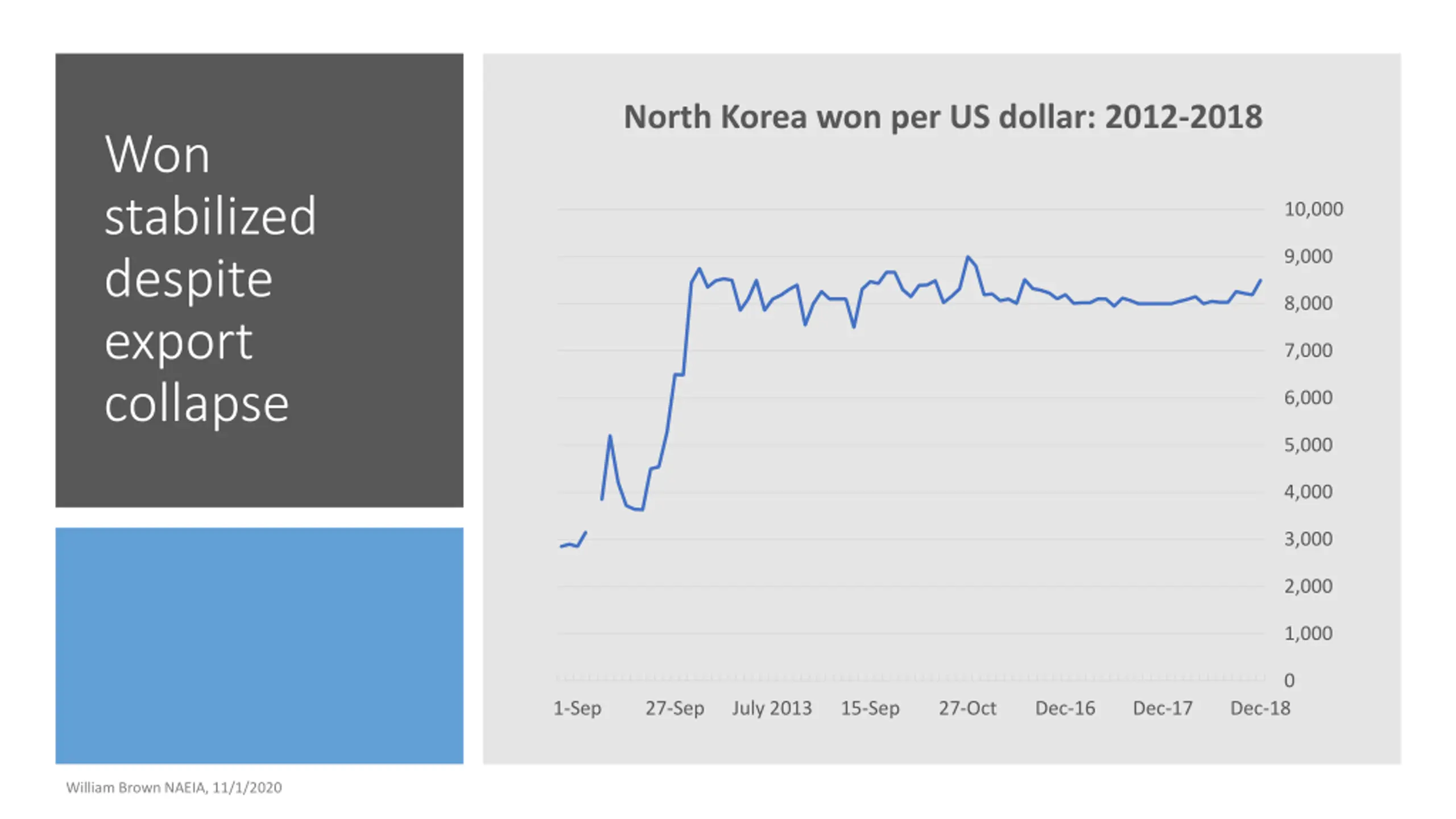North Korea won per US dollar: 2012-2018 Won stabilized despite export collapse 10,000 9,000 8,000 7,000 6,000 5,000 4,000 3,000 2,000 1,000 0 1-Sep 27-Sep July 2013 15-Sep 27-Oct Dec-16 Dec-17 Dec-18 William Brown NAEIA, 11/1/2020