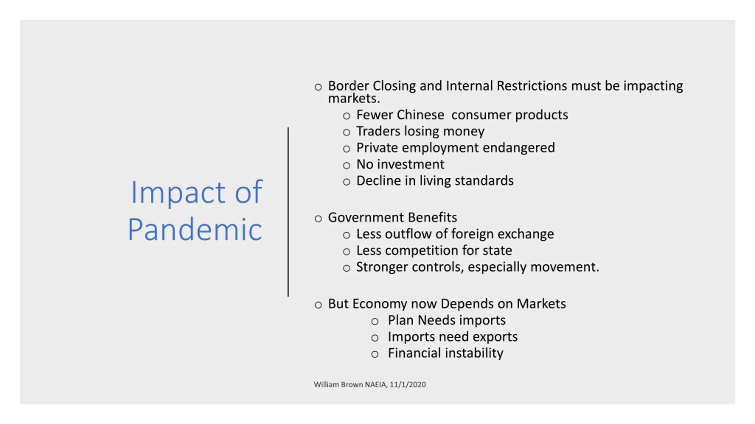 o Border Closing and Internal Restrictions must be impacting markets. o Fewer Chinese consumer products o Traders losing money o Private employment endangered o No investment o Decline in living standards Impact of Pandemic o Government Benefits o Less outflow of foreign exchange o Less competition for state o Stronger controls, especially movement. o But Economy now Depends on Markets o Plan Needs imports o Imports need exports o Financial instability