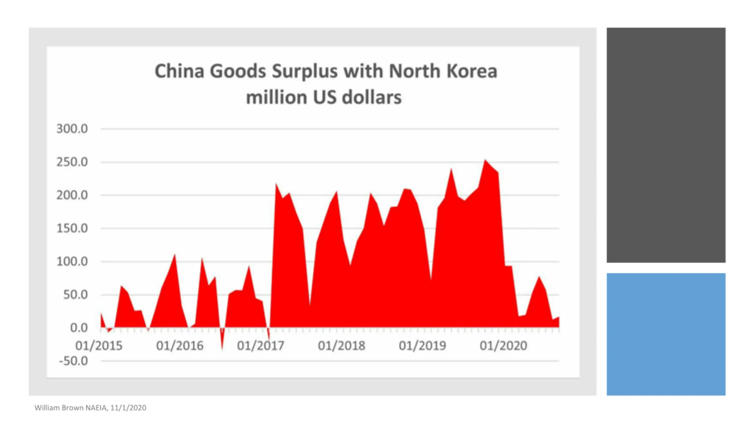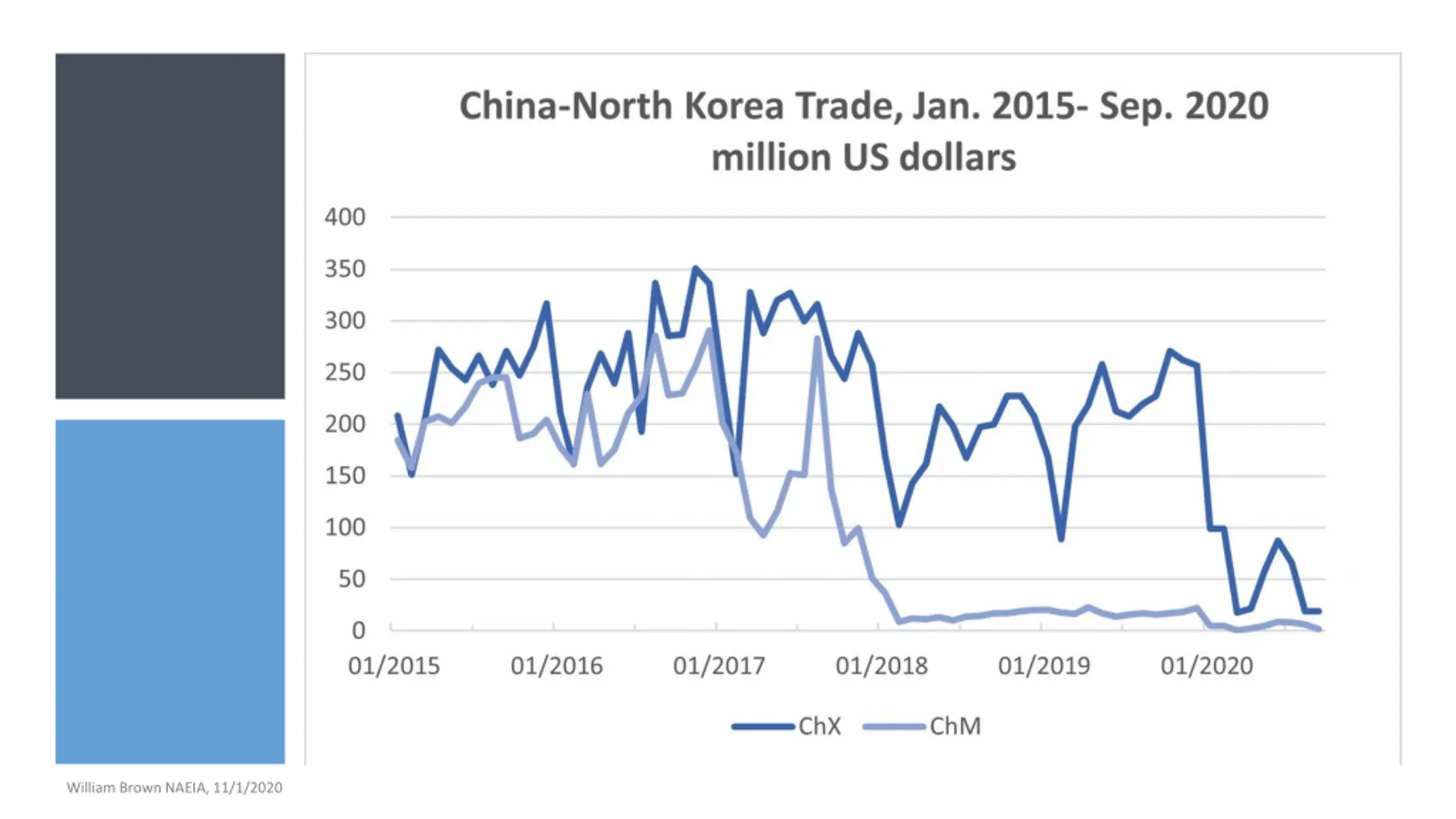 North Korea Won per China Yuan 2019-2020 1,400 1,300 1,200 1,100 1,000 900 800 700 9/1/2019 11/12019 1/1/2020 3/1/2020 5/1/2020 7/1/2020 9/1/2020 11/1/2020 Asia Press, source data. William Brown NAEIA, 11/1/2020