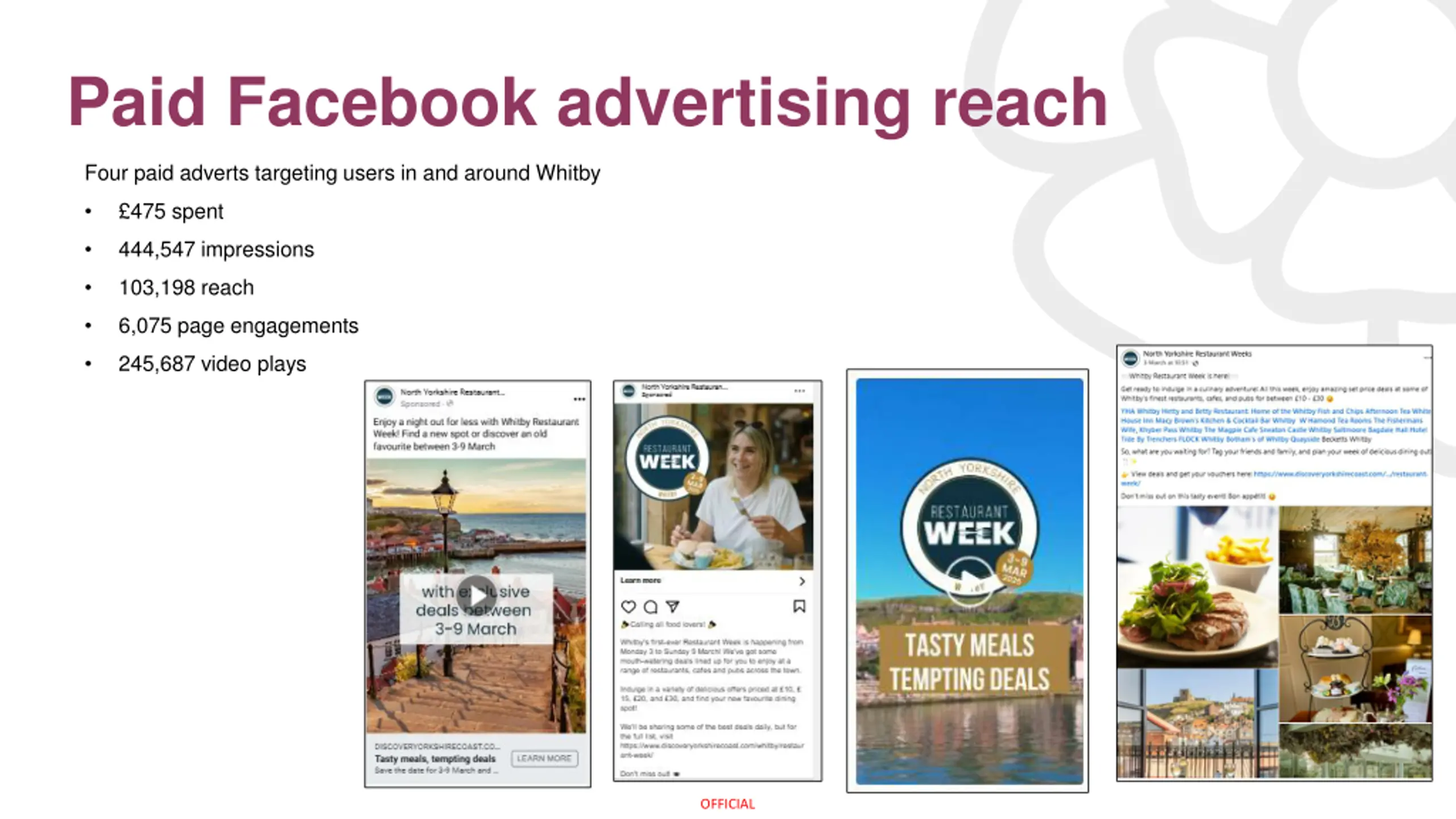 Paid Facebook advertising reach Four paid adverts targeting users in and around Whitby 475 spent 444,547 impressions 103,198 reach 6,075 page engagements 245,687 video plays OFFICIAL