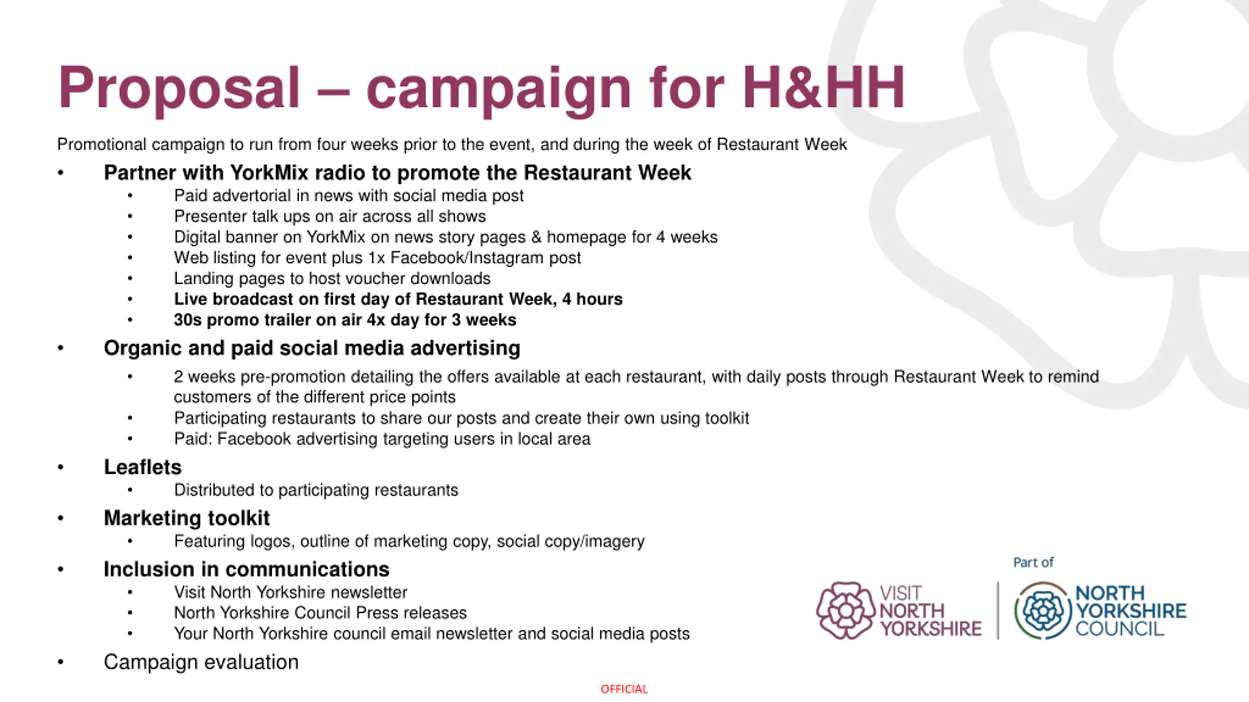 Proposal campaign for H&HH Promotional campaign to run from four weeks prior to the event, and during the week of Restaurant Week Partner with YorkMix radio to promote the Restaurant Week Paid advertorial in news with social media post Presenter talk ups on air across all shows Digital banner on YorkMix on news story pages & homepage for 4 weeks Web listing for event plus 1x Facebook/Instagram post Landing pages to host voucher downloads Live broadcast on first day of Restaurant Week, 4 hours 30s promo trailer on air 4x day for 3 weeks Organic and paid social media advertising 2 weeks pre-promotion detailing the offers available at each restaurant, with daily posts through Restaurant Week to remind customers of the different price points Participating restaurants to share our posts and create their own using toolkit Paid: Facebook advertising targeting users in local area Leaflets Distributed to participating restaurants Marketing toolkit Featuring logos, outline of marketing copy, social copy/imagery Inclusion in communications Visit North Yorkshire newsletter North Yorkshire Council Press releases Your North Yorkshire council email newsletter and social media posts Campaign evaluation OFFICIAL