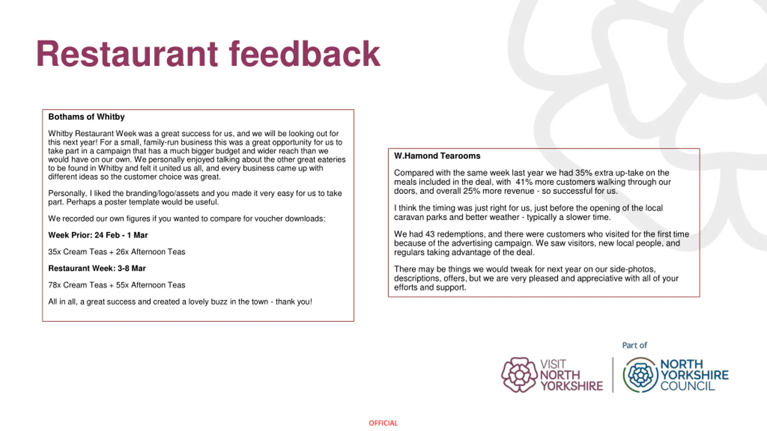 Restaurant feedback Bothams of Whitby Whitby Restaurant Week was a great success for us, and we will be looking out for this next year! For a small, family-run business this was a great opportunity for us to take part in a campaign that has a much bigger budget and wider reach than we would have on our own. We personally enjoyed talking about the other great eateries to be found in Whitby and felt it united us all, and every business came up with different ideas so the customer choice was great. W.Hamond Tearooms Compared with the same week last year we had 35% extra up-take on the meals included in the deal, with 41% more customers walking through our doors, and overall 25% more revenue - so successful for us. Personally, I liked the branding/logo/assets and you made it very easy for us to take part. Perhaps a poster template would be useful. I think the timing was just right for us, just before the opening of the local caravan parks and better weather - typically a slower time. We recorded our own figures if you wanted to compare for voucher downloads: We had 43 redemptions, and there were customers who visited for the first time because of the advertising campaign. We saw visitors, new local people, and regulars taking advantage of the deal. Week Prior: 24 Feb - 1 Mar 35x Cream Teas + 26x Afternoon Teas Restaurant Week: 3-8 Mar There may be things we would tweak for next year on our side-photos, descriptions, offers, but we are very pleased and appreciative with all of your efforts and support. 78x Cream Teas + 55x Afternoon Teas All in all, a great success and created a lovely buzz in the town - thank you! OFFICIAL