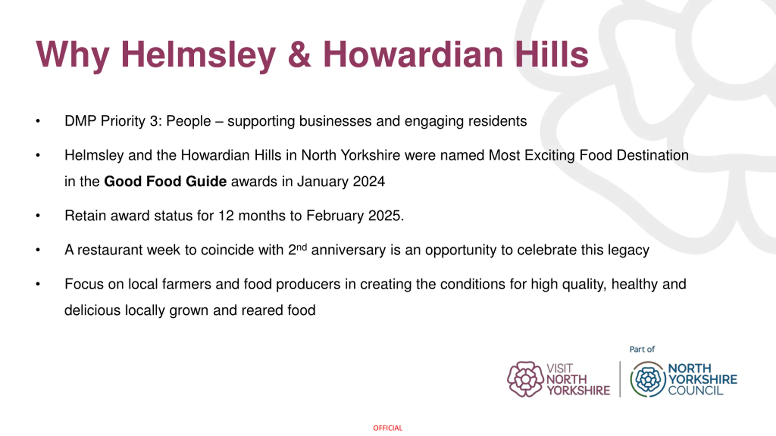 Why Helmsley & Howardian Hills DMP Priority 3: People supporting businesses and engaging residents Helmsley and the Howardian Hills in North Yorkshire were named Most Exciting Food Destination in the Good Food Guide awards in January 2024 Retain award status for 12 months to February 2025. A restaurant week to coincide with 2ndanniversary is an opportunity to celebrate this legacy Focus on local farmers and food producers in creating the conditions for high quality, healthy and delicious locally grown and reared food OFFICIAL