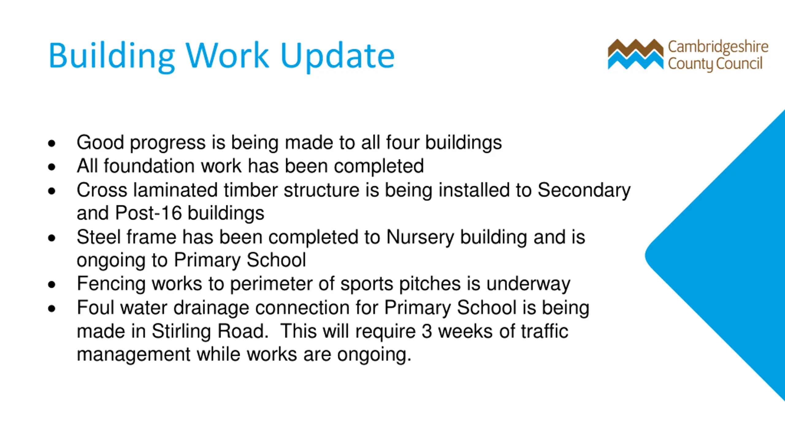 Building Work Update Good progress is being made to all four buildings All foundation work has been completed Cross laminated timber structure is being installed to Secondary and Post-16 buildings Steel frame has been completed to Nursery building and is ongoing to Primary School Fencing works to perimeter of sports pitches is underway Foul water drainage connection for Primary School is being made in Stirling Road. This will require 3 weeks of traffic management while works are ongoing.