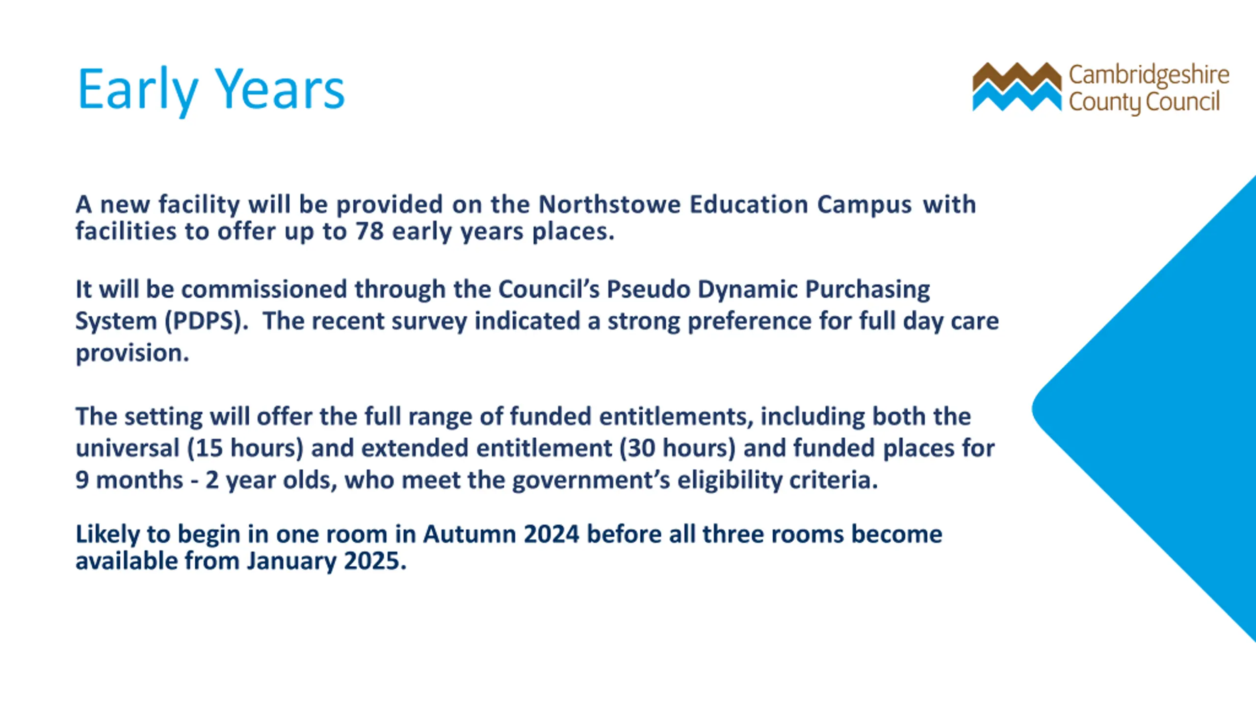 Early Years A new facility will be provided on the Northstowe Education Campus with facilities to offer up to 78 early years places. It will be commissioned through the Council s Pseudo Dynamic Purchasing System (PDPS). The recent survey indicated a strong preference for full day care provision. The setting will offer the full range of funded entitlements, including both the universal (15 hours) and extended entitlement (30 hours) and funded places for 9 months - 2 year olds, who meet the government s eligibility criteria. Likely to begin in one room in Autumn 2024 before all three rooms become available from January 2025.